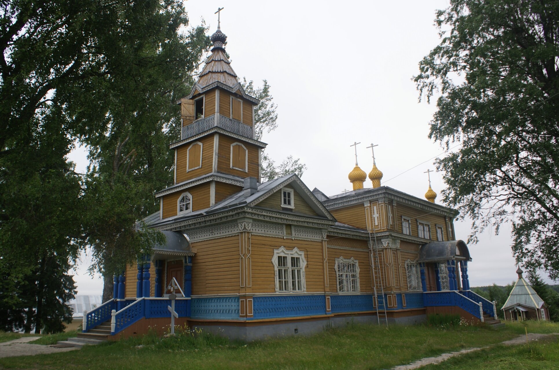 Особое внимание приковывают луковичные главы храма, покрытые деревянным лемехом и увенчанные крестами. Эти купола не только выполняют декоративную функцию, но и несут глубокую символику, олицетворяя собранность духа и горение в молитве. Фасад церкви окрашен в тёплый жёлтый цвет, создающий ощущение света и благодати, а декоративные элементы - наличники, карнизы и ступени - выделены синим цветом, что символизирует небесную чистоту и Богородичное начало.