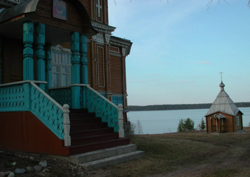 На представленной фотографии запечатлена Церковь Преображения Господня, расположенная в живописной деревне Интерпосёлок на берегу озера Сямозеро в Пряжинском районе Республики Карелия. Храм является частью архитектурного ансамбля Важеозерского монастыря и представляет собой прекрасный образец традиционного русского деревянного зодчества.