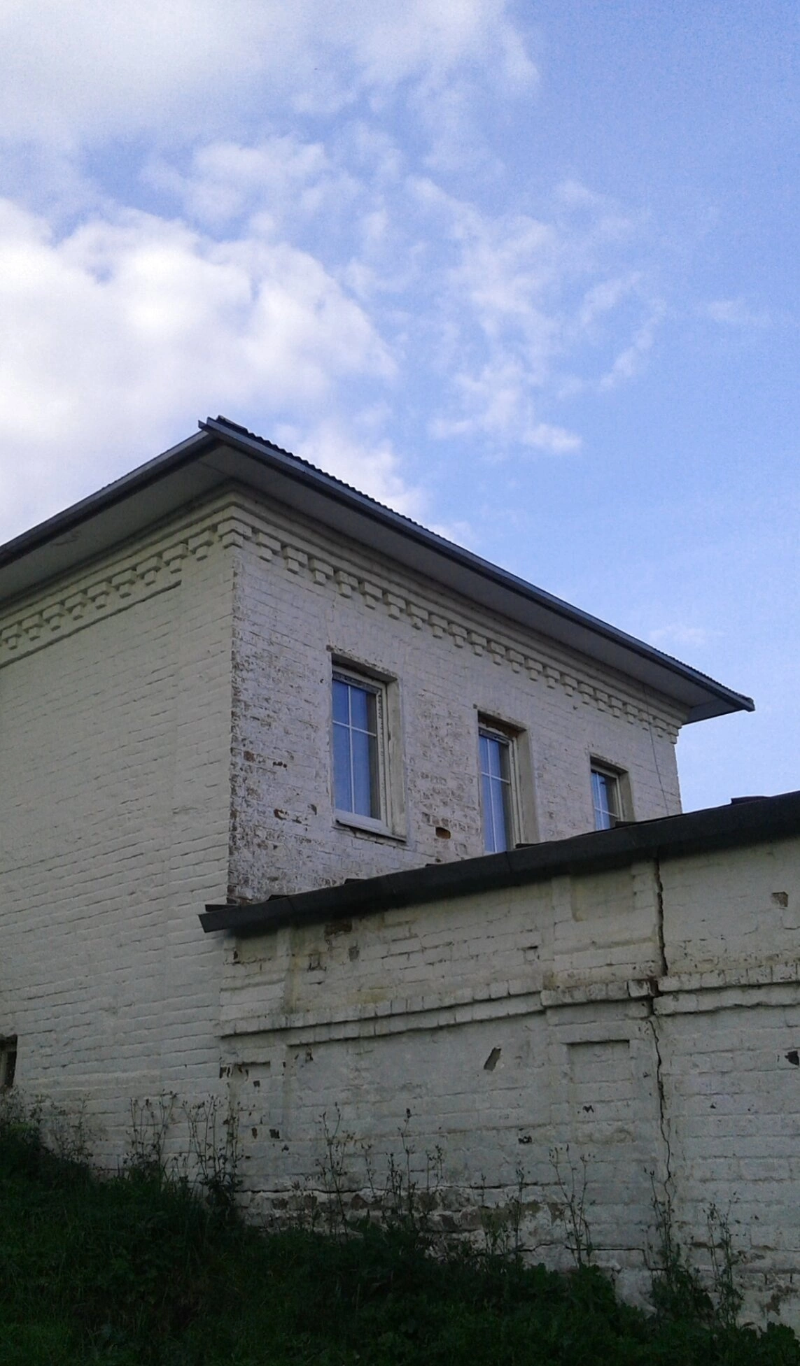 Угловая часть строения, видимая на снимке, демонстрирует массивные стены, прорезанные высокими арочными оконными проёмами, которые обеспечивают обилие естественного света во внутреннем пространстве храма. Состояние кладки свидетельствует о почтенном возрасте сооружения: заметны следы естественного износа, трещины и воздействия непогоды, что придаёт памятнику особую атмосферу благоговейной старины. Водосточные трубы, идущие вдоль стены к металлической кровле, являются частью более поздних инженерных приспособлений.