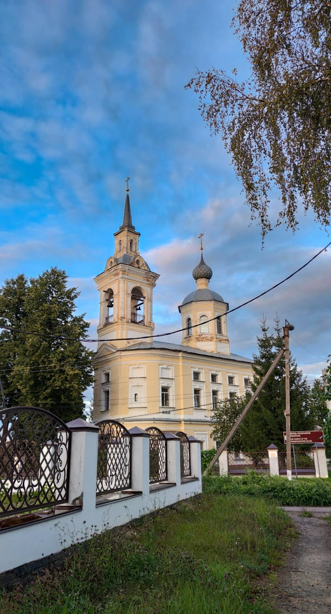На представленной фотографии запечатлён величественный храмовый комплекс — Церковь Преображения Господня, расположенная в историческом центре города Нерехты Костромской области. Этот двухэтажный каменный храм является выдающимся памятником русской церковной архитектуры второй половины XVIII века и ярким образцом стиля позднее барокко.