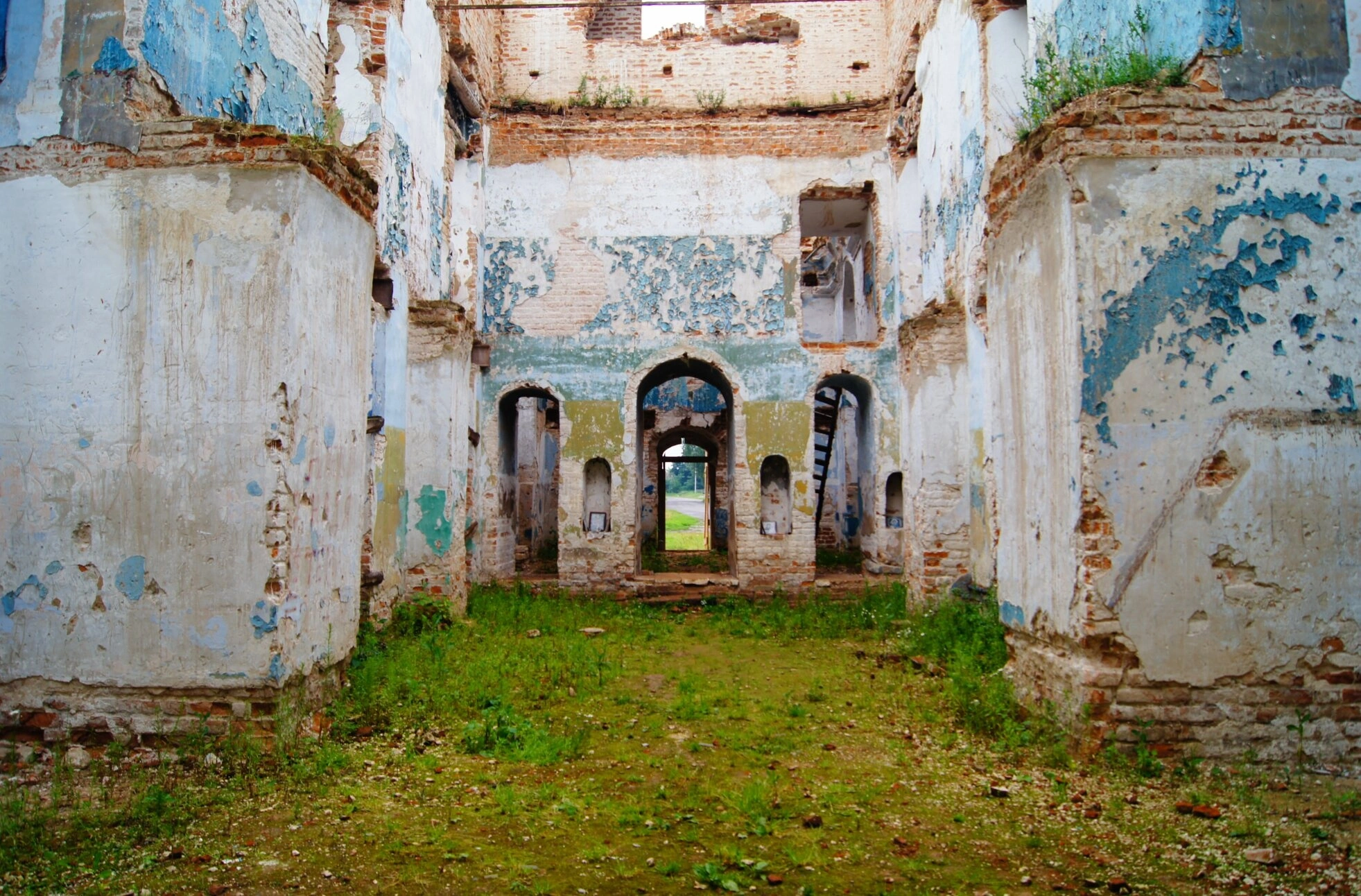Снимок позволяет рассмотреть масштаб разрушений, постигших дом Божий. Своды и стены храма, лишённые кровли, открыты небу и непогоде. Штукатурка осыпалась, обнажив кирпичную кладку, а по поверхности стен проступают многочисленные трещины. В центральной части алтаря ещё угадываются очертания запрестольного пространства, где некогда совершалась Божественная литургия.