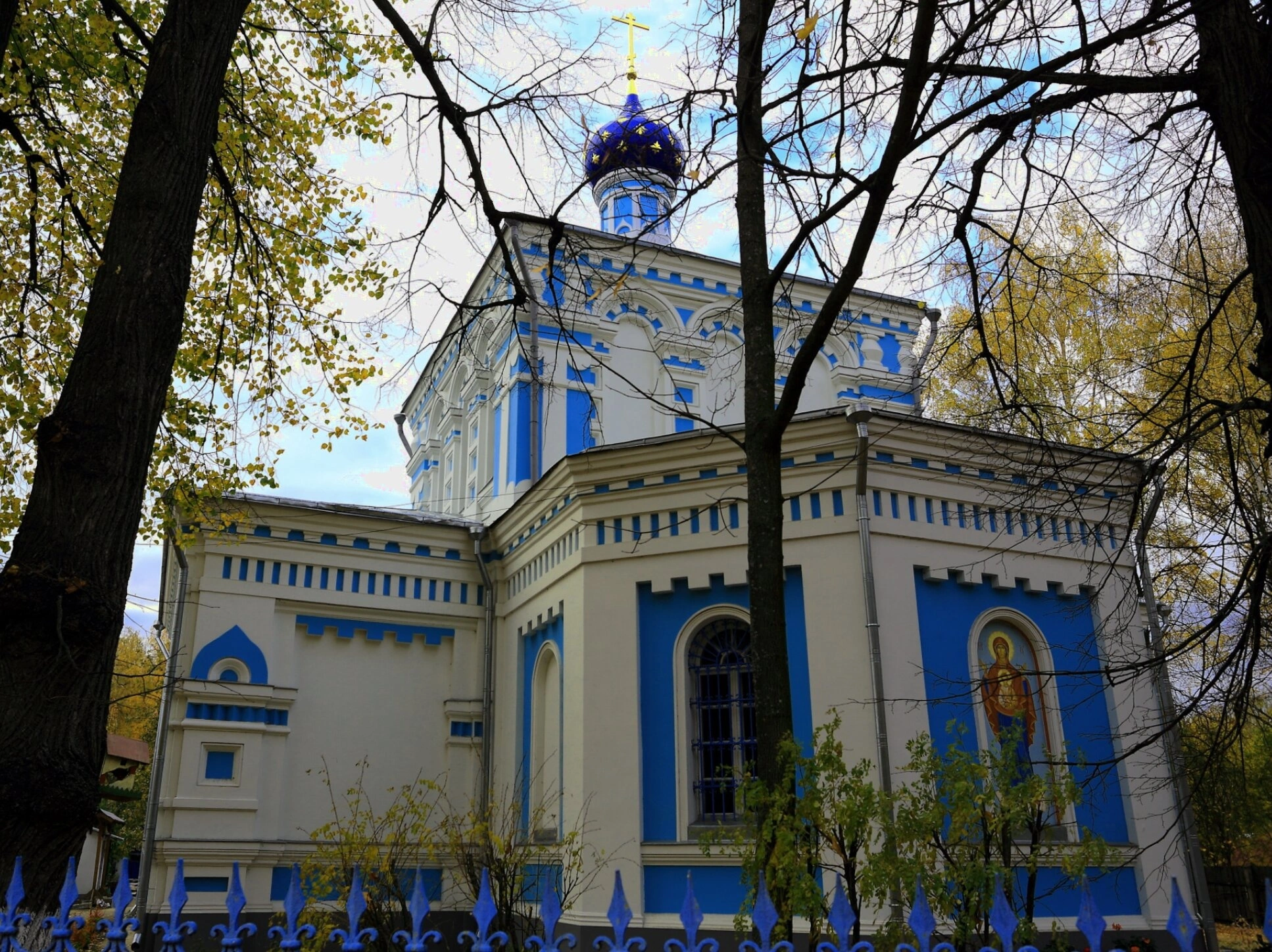 Архитектурное решение храма демонстрирует гармоничное сочетание эклектики и элементов русского стиля. Светлый фасад здания украшен изящными синими декоративными элементами, создающими торжественный облик. Особое внимание привлекает монументальный синий купол, увенчанный золочёным крестом и украшенный золотыми звёздами, символизирующими небесную славу.