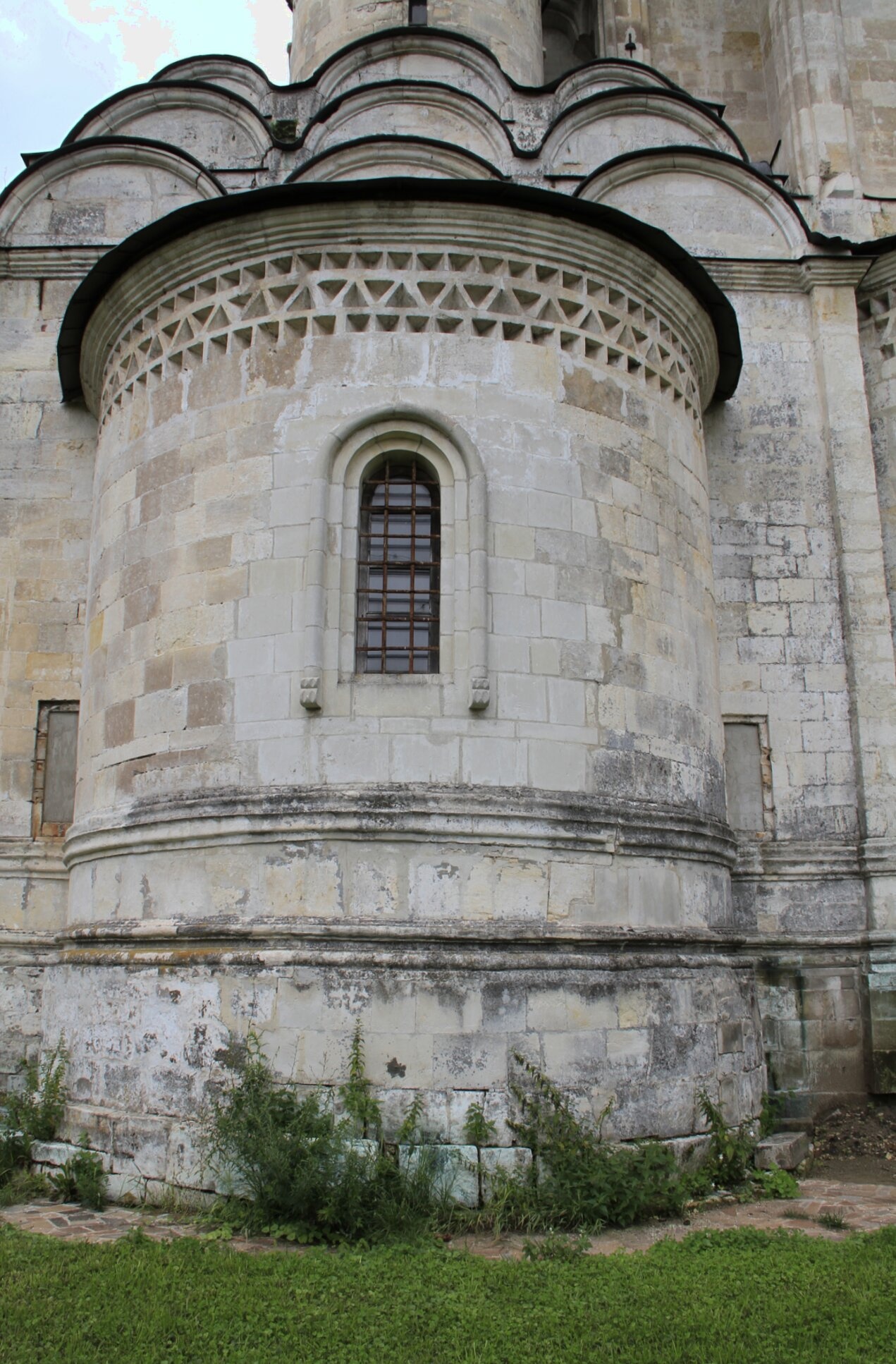 Здание сложено из тёсаного белого камня, традиционного для зодчества той эпохи. На снимке хорошо видна характерная кладка и детали оформления фрагмента восьмерика, на котором покоится высокий шатёр храма. Арочное окно, украшенное кованой решёткой, обрамлено наличником. Ниже оконного проёма проходят горизонтальные рельефные пояса, придающие фасаду особую выразительность и строгость. Выше окна расположен декоративный фриз с геометрическим орнаментом, который, по мнению исследователей, является основанием венчающего храм шатра.