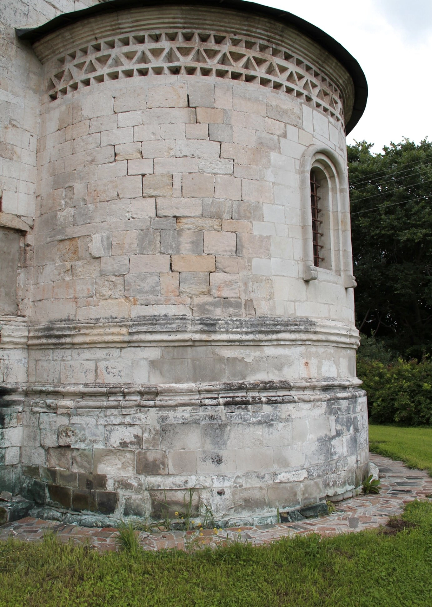 Изображение позволяет детально рассмотреть качество белокаменной кладки, выполненной из тщательно отёсанных блоков. В центре композиции — изящное полукруглое арочное окно, обрамлённое скромным наличником. Непосредственно над оконным проёмом проходит декоративный фриз, украшенный поребриком и аркатурным поясом, характерным для храмового зодчества Руси.