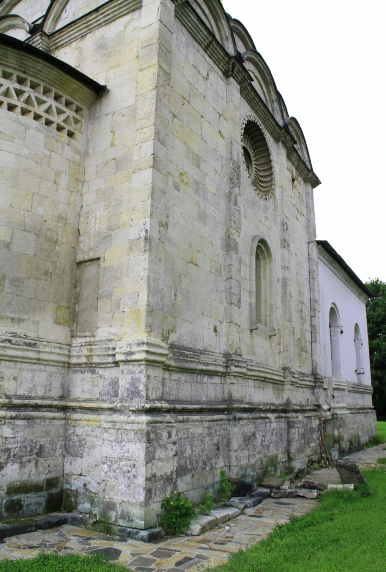 Ярус здания сложен из массивных блоков белого камня, поверхность которого покрылась благородной патиной времени и мягкими подушками мха, свидетельствующими о его многовековой истории. Чётко просматриваются элементы декоративного убранства: глубокие ниши, перспективные арочные проёмы, некогда служившие входами, и строгие лопатки, членящие стену. Особое внимание привлекает мощный цоколь и рельефная фактура стены, демонстрирующая высочайшее мастерство белокаменных дел мастеров времён правления Ивана Грозного.