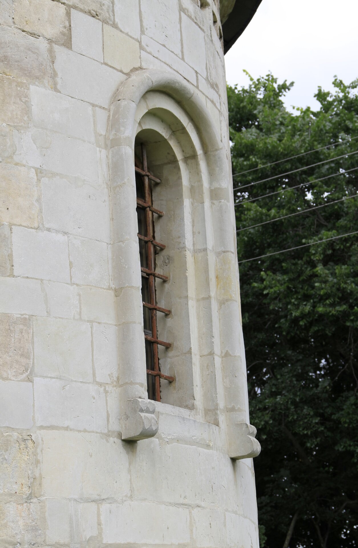 Особого внимания заслуживают оконные проёмы, представленные в двух формах. Первое окно имеет прямоугольную форму с арочным завершением и выразительным каменным обрамлением, что свидетельствует о внимании к деталям и символической насыщенности архитектуры. Второе окно круглое, украшенное рельефным орнаментом, напоминающим лучи или лепестки. Подобный убор часто ассоциируется с божественным светом и духовным просвещением, что глубоко соответствует назначению храма. Оба окна снабжены металлическими решётками, которые не только выполняют защитную функцию, но и дополняют эстетическое восприятие фасада.