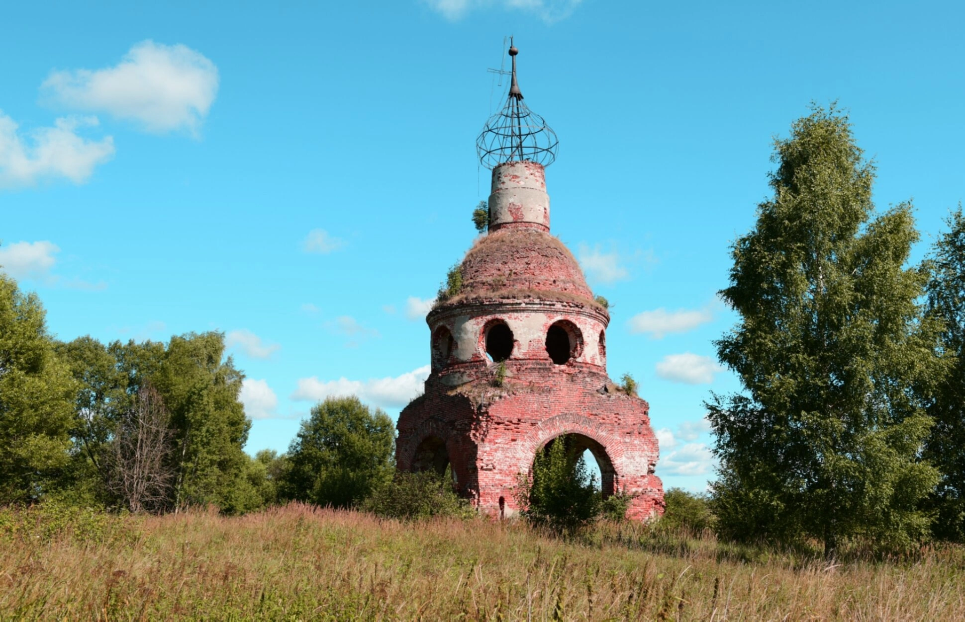 Колокольня, сложенная из красного кирпича, гордо возвышается посреди полей. Её арочные проёмы, лишённые ныне колоколов, зияют пустотой, напоминая о былом церковном благолепии. В верхнем ярусе угадываются два круглых окна-люкарны, а на самом верху сохранился металлический каркас - последнее свидетельство существовавшего здесь ранее купола или шпиля.