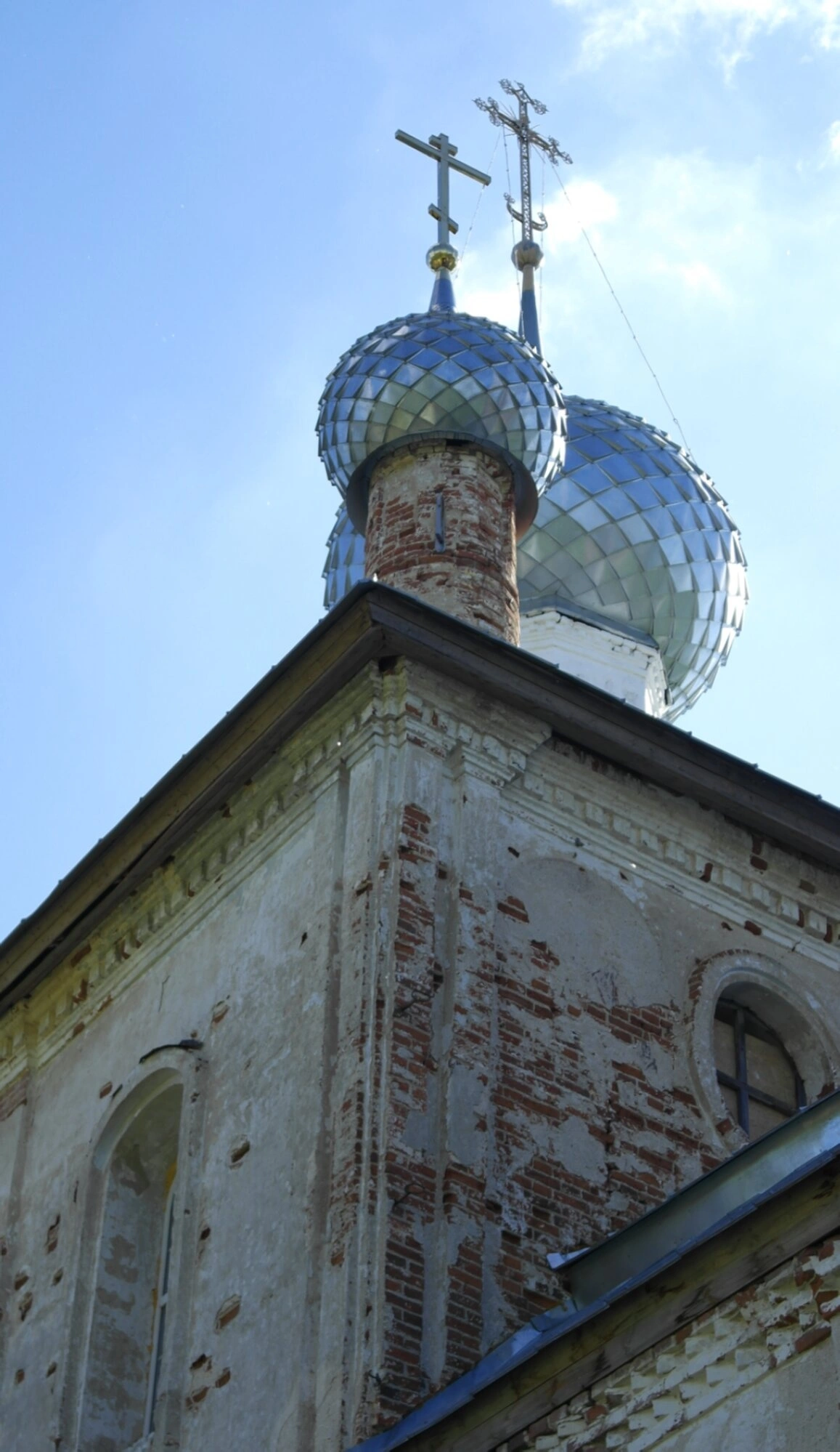 Ракурс съёмки, выбранный фотографом, позволяет оценить монументальность сооружения и его архитектурные детали, включая кирпичную кладку и элементы декора, характерные для церковного зодчества екатерининской эпохи. Чистое голубое небо на заднем плане символически подчёркивает духовную чистоту и величие этого святого места, которое продолжает быть центром православной жизни Мышкинской земли.