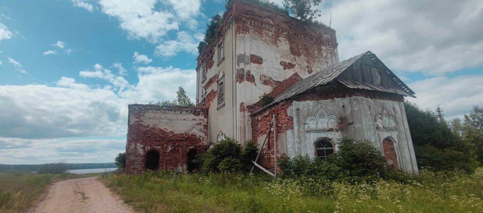 На представленной фотографии запечатлена полуразрушенная Церковь Преображения Господня, расположенная в бывшем селе Столпино Кадыйского района Костромской области. Храм, возведённый из красного кирпича, стоит на живописном берегу реки Нёмда, на фоне бескрайнего голубого неба с кучевыми облаками.