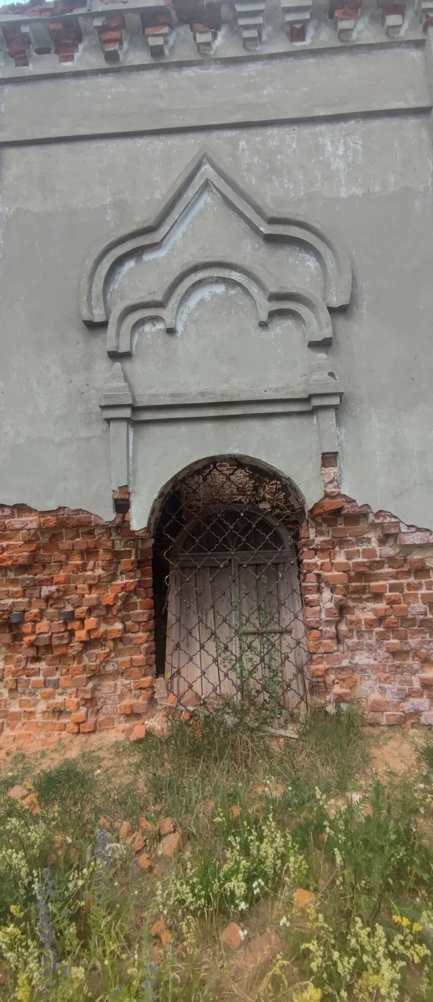 Выше кирпичного основания стены оштукатурены и имеют характерный серый оттенок времени. Над арочным дверным проёмом, ныне закрытым металлической решёткой, сохранился декоративный архитектурный элемент в форме кокошника — традиционного украшения православных храмов Руси. Этот элемент, несмотря на повреждения, сохраняет следы былого благолепия и указывает на значение храма как дома молитвы.