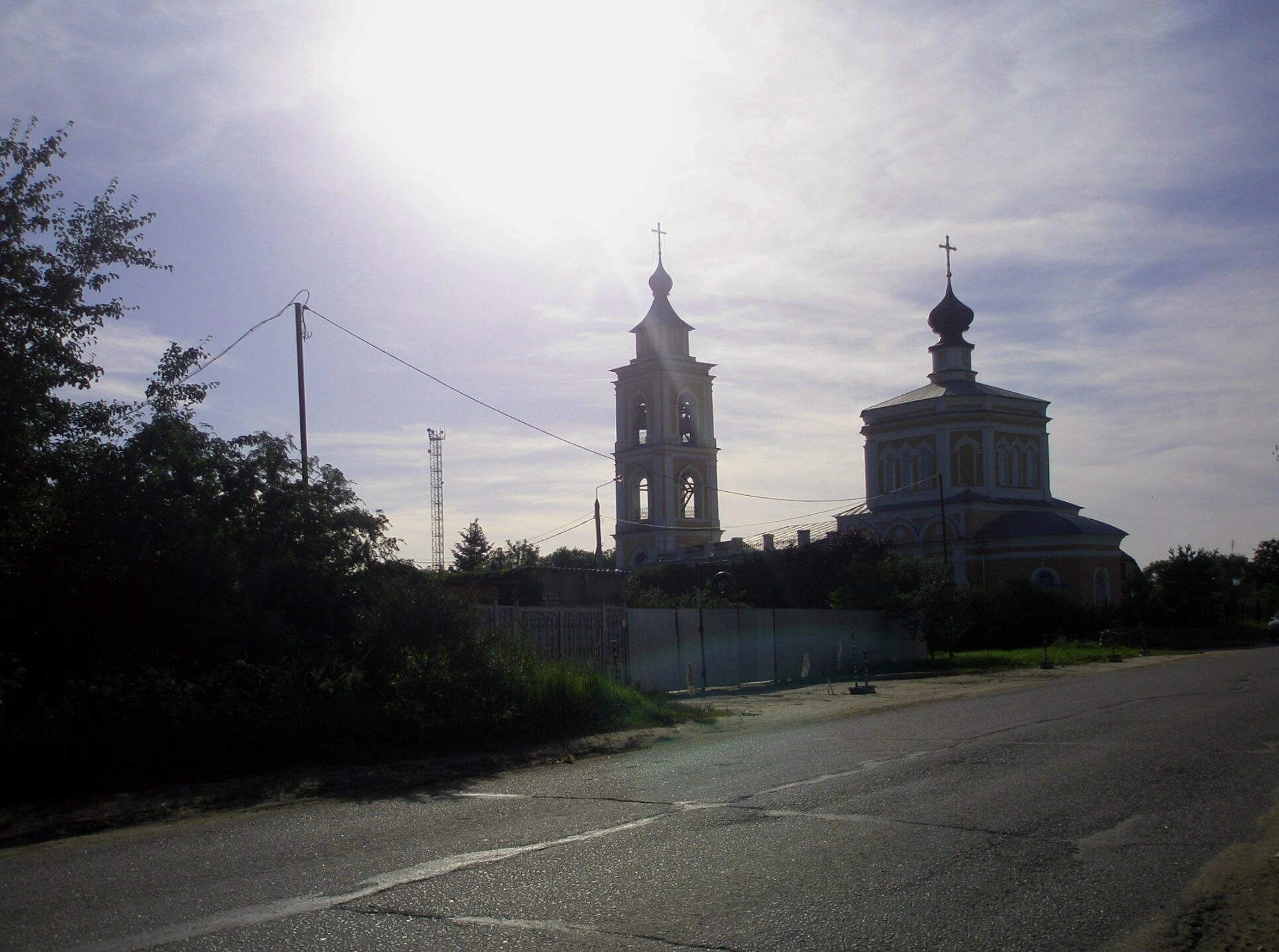 На фотографии запечатлен благодатный архитектурный ансамбль в селе Вельяминово, включающий в себя величественный Благовещенский собор и отдельно стоящую стройную колокольню Церкви Воскресения Преображения Господня. Святые места ярко освещены лучами солнца, которые, пробиваясь сквозь облака, создают божественное сияние вокруг храмовых главок и крестов, что символизирует благодать Божию, осеняющую сию древнюю обитель.