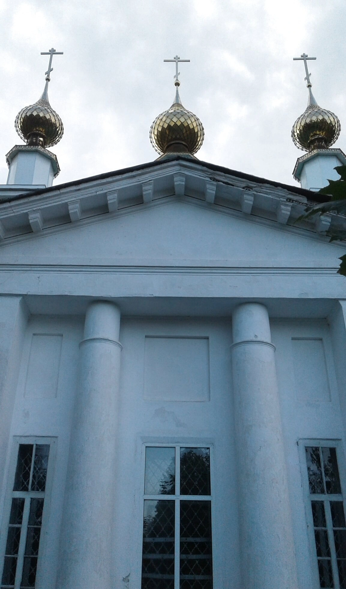 Светлый фасад храма выполнен в классическом стиле, с использованием колонн и пилястр, которые придают зданию монументальность и величие. Прямоугольные окна с решетчатыми переплётами пропускают внутрь обильный свет, создавая особую атмосферу для молитвенного сосредоточения. Снимок сделан снизу вверх, что подчёркивает высоту и устремлённость храма к небу, а также позволяет рассмотреть детали архитектуры верхней части здания.