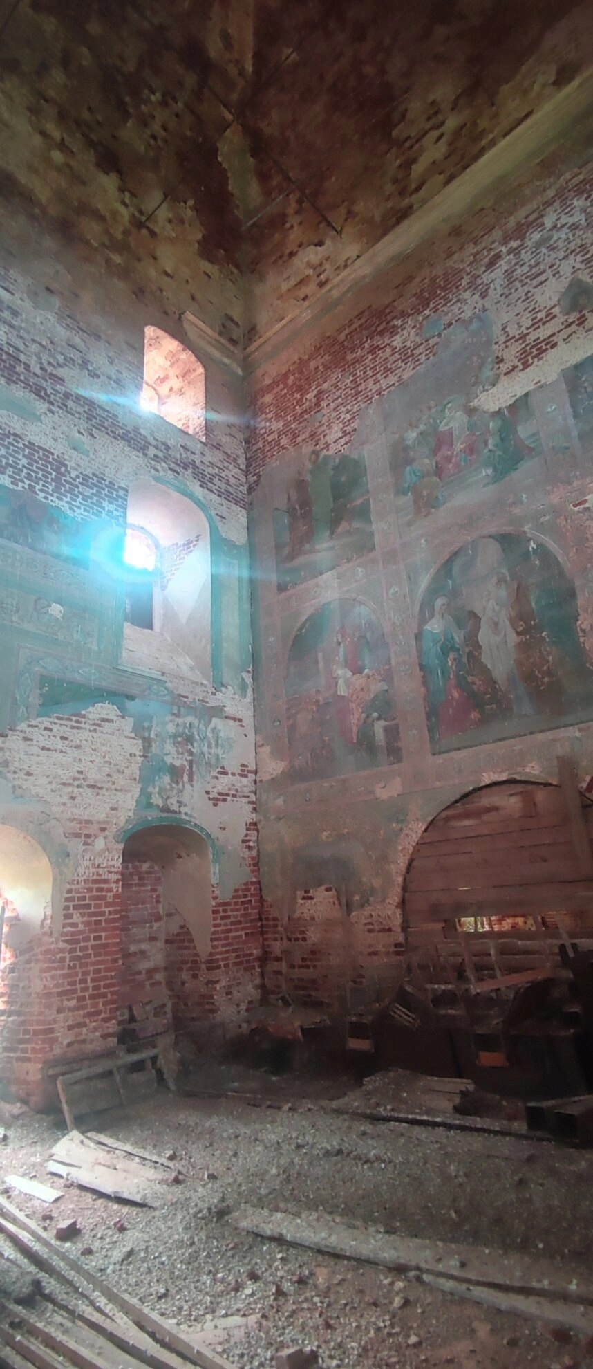 Несмотря на значительное разрушение, внутреннее пространство церкви сохраняет свидетельства былого благолепия. На стенах и сводах трапезной можно видеть уникальные фресковые росписи, созданные в XVIII веке. В полумраке заброшенного храма мерцают образы Пресвятой Богородицы, Симеона Богоприимца, Спасителя и ликов святых. Особую художественную и духовную ценность представляют изображения ангелов, трубящих славу, которые сохранились на сводах, несмотря на разрушительное воздействие времени.