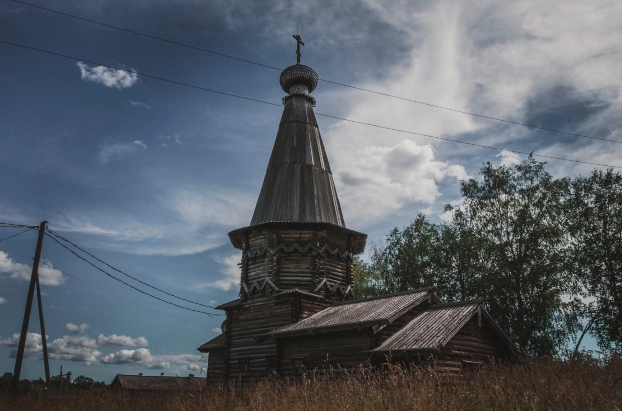 На представленной фотографии запечатлена старинная деревянная церковь во имя преподобного Александра Свирского, расположенная в карельском селе Космозеро. Этот уникальный храмовый комплекс, освящённый в честь великого русского святого, был возведён в 1769 году и представляет собой выдающийся образец северного деревянного зодчества.