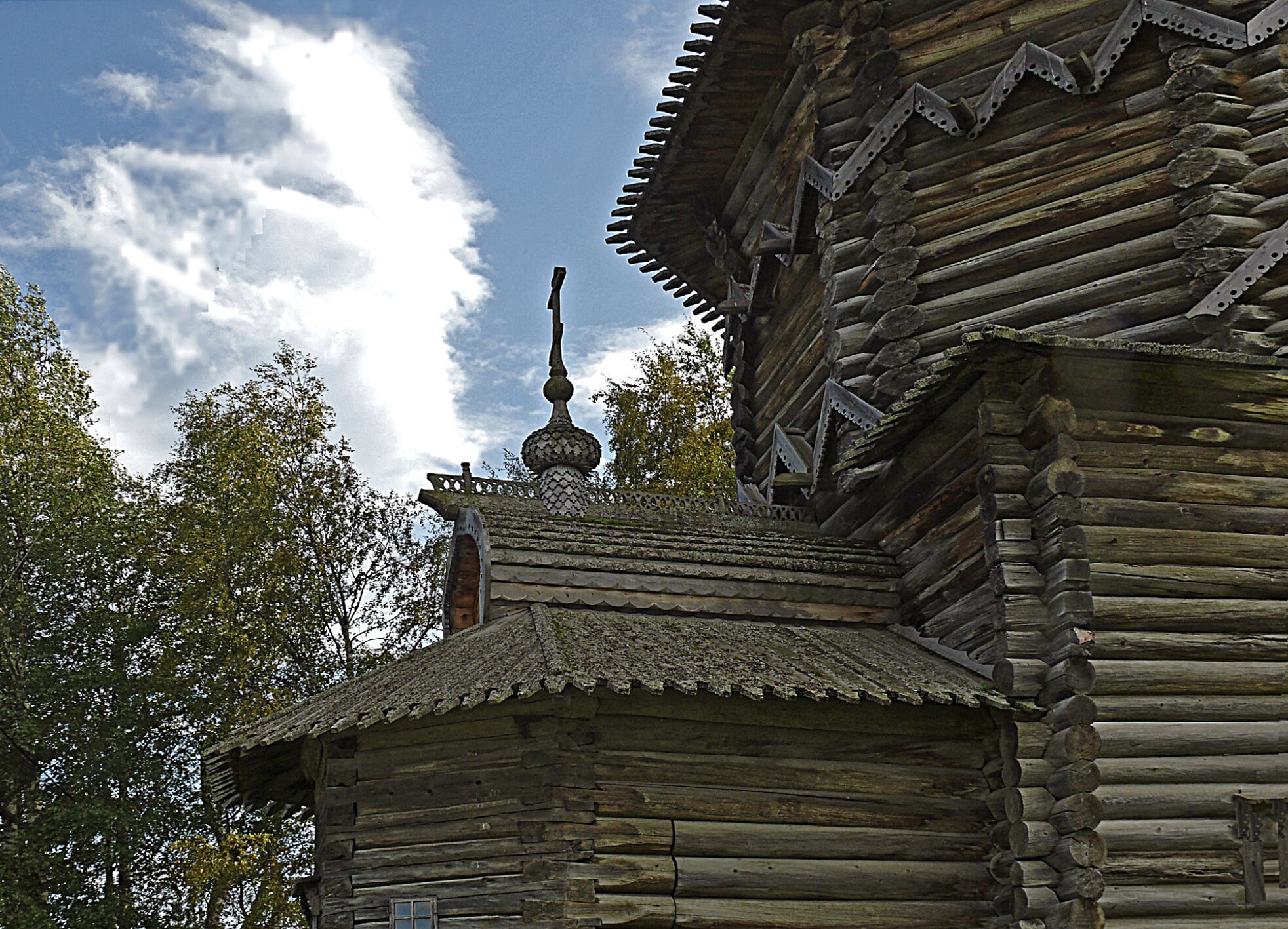 На представленной фотографии запечатлена Церковь во имя преподобного Александра Свирского, расположенная в старинном карельском селе Космозеро на берегу одноимённого озера. Этот уникальный памятник деревянного зодчества, освящённый в честь великого русского святого, является ярким образцом прионежской школы храмовой архитектуры.