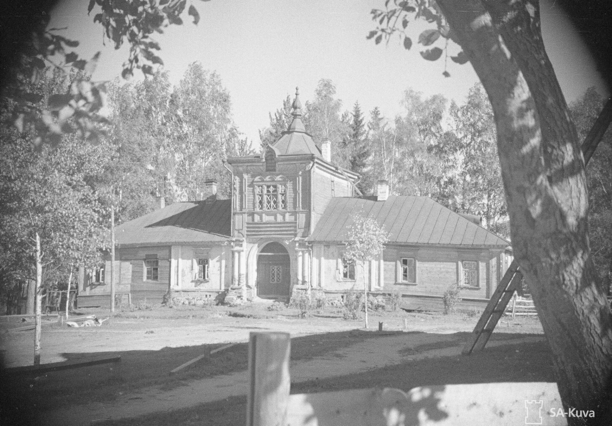 На представленной фотографии запечатлена Церковь во имя преподобного Иоанна Рыльского, расположенная на территории Важеозерского Спасо-Преображенского мужского монастыря в карельском Интерпосёлке. Храм был возведён в период с 1896 по 1898 год и освящён в честь великого болгарского святого, почитаемого throughout всем православном мире.