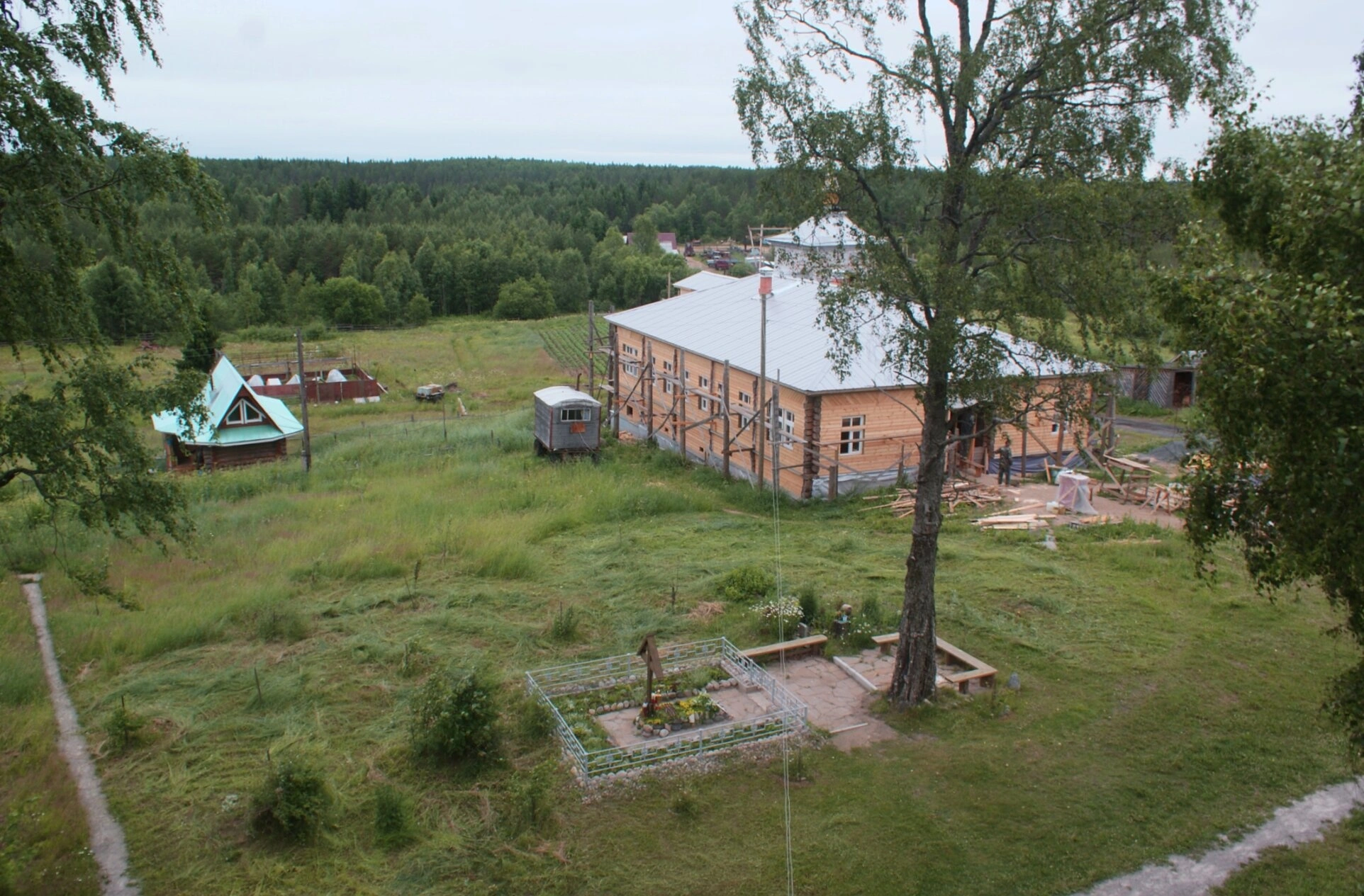 Монастырский комплекс органично вписан в природное окружение: высокие деревья, включая берёзы — символы России, обрамляют святую обитель, подчёркивая единение творения рук человеческих и Божьего мира. На заднем плане виднеются иные хозяйственные постройки, необходимые для жизни и трудов монашеской братии. Данная фотография является ценным свидетельством современного состояния и развития одной из значимых северных православных святынь.