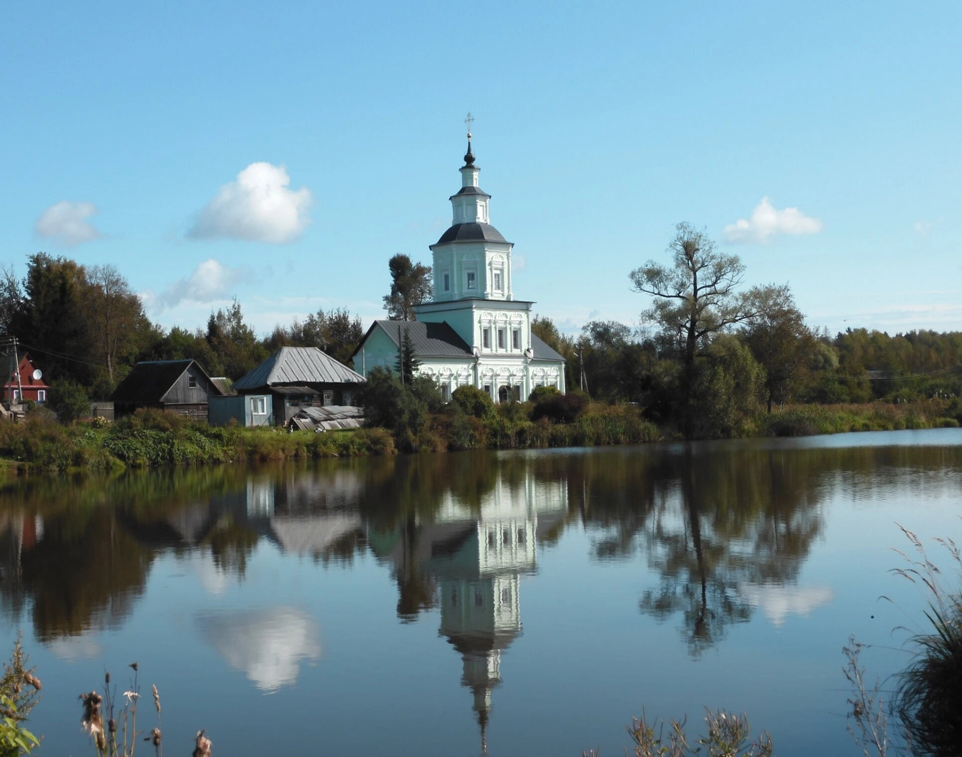Окружающий пейзаж дополняет благоговейную атмосферу места. Храм утопает в зелени деревьев и кустарников, а по берегам пруда растет высокая луговая трава. С левой стороны от святыни виднеются скромные деревянные строения, характерные для русской сельской местности. Чистое голубое небо с легкими кучевыми облаками и мягкое солнечное освещение подчеркивают уют и духовную теплоту этого намоленного места.