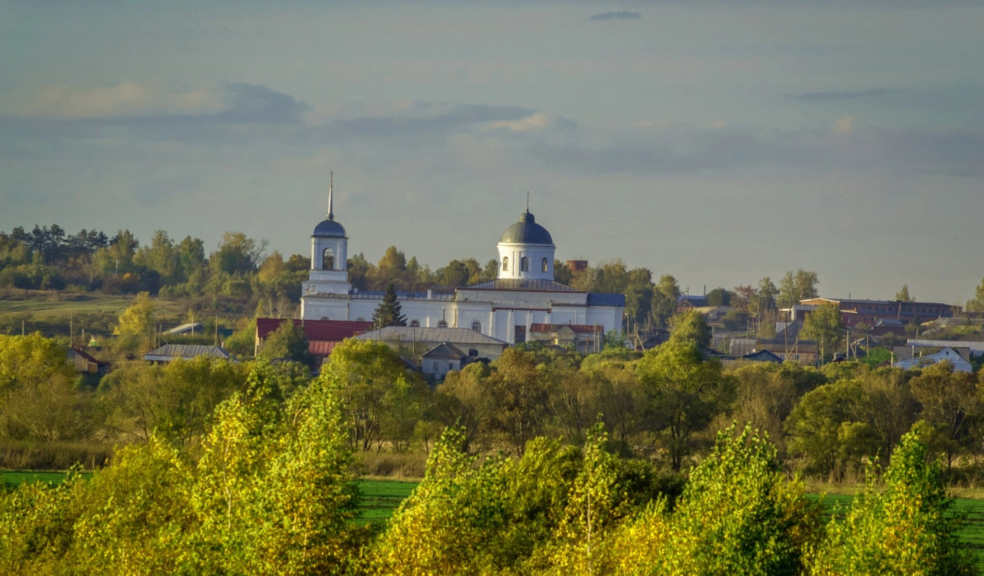 Осенняя природа создает особое обрамление для церковного ансамбля. Деревья с золотистой листвой обрамляют передний план, подчеркивая величие духовной доминанты села. Рассеянный свет через облачное небо мягко освещает храмовые стены, создавая молитвенную атмосферу уединенности и покоя.