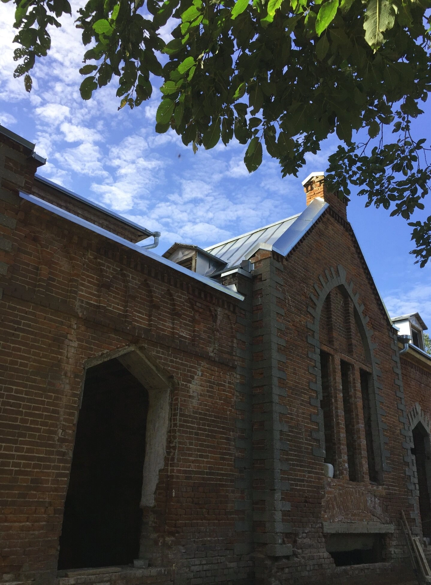 Церковное здание возведено из красного кирпича и демонстрирует характерные элементы храмовой архитектуры. Высокие арочные оконные проёмы и стрельчатое завершение верхнего окна придают сооружению особое духовное величие. На момент съёмки на кровле уже установлены новые металлические отливы, что указывает на активную фазу ремонтных работ.