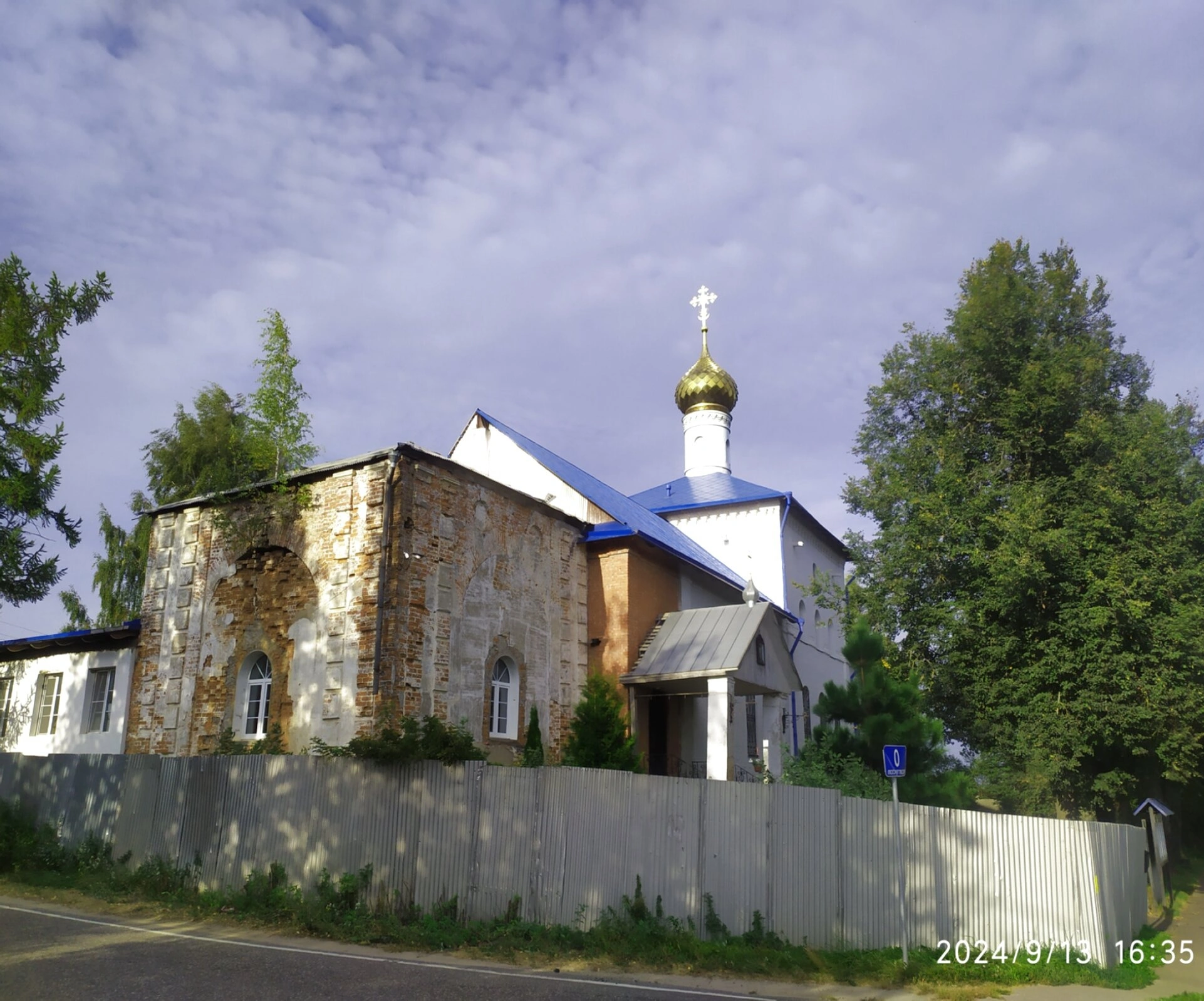 Над обновлённой частью храма возвышается голубой барабан, завершающийся златоверхим куполом, на котором установлен православный восьмиконечный крест, сияющий в лучах божественного света. В старой части здания просматриваются арочные оконные проёмы с белыми рамами, характерные для традиционного церковного зодчества.
