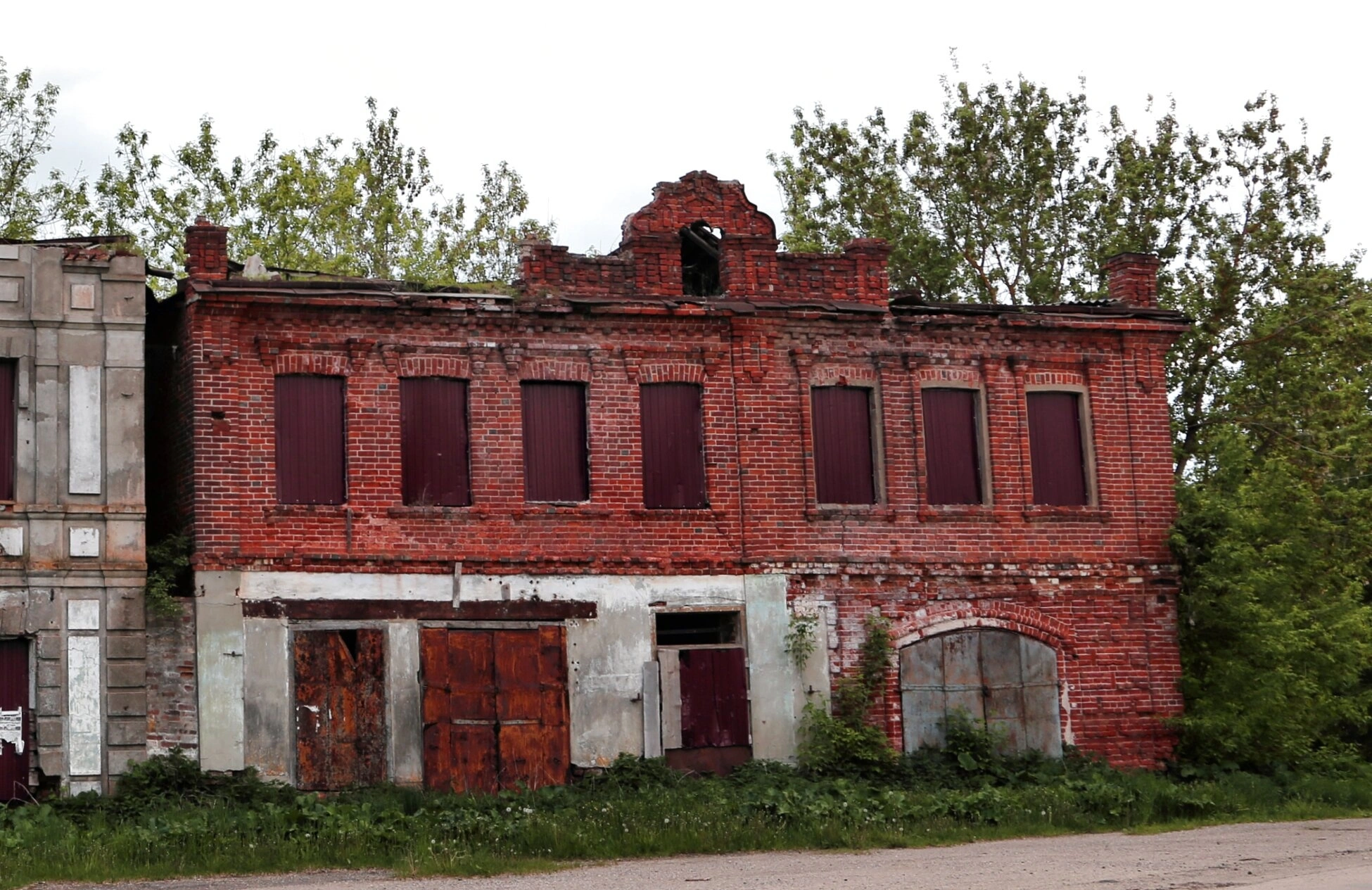 На представленной фотографии запечатлено историческое здание, расположенное в селе Аньково Ильинского района Ивановской области. Данное строение представляет собой двухэтажное кирпичное здание, выполненное из красного кирпича и находящееся в настоящее время в заброшенном состоянии.