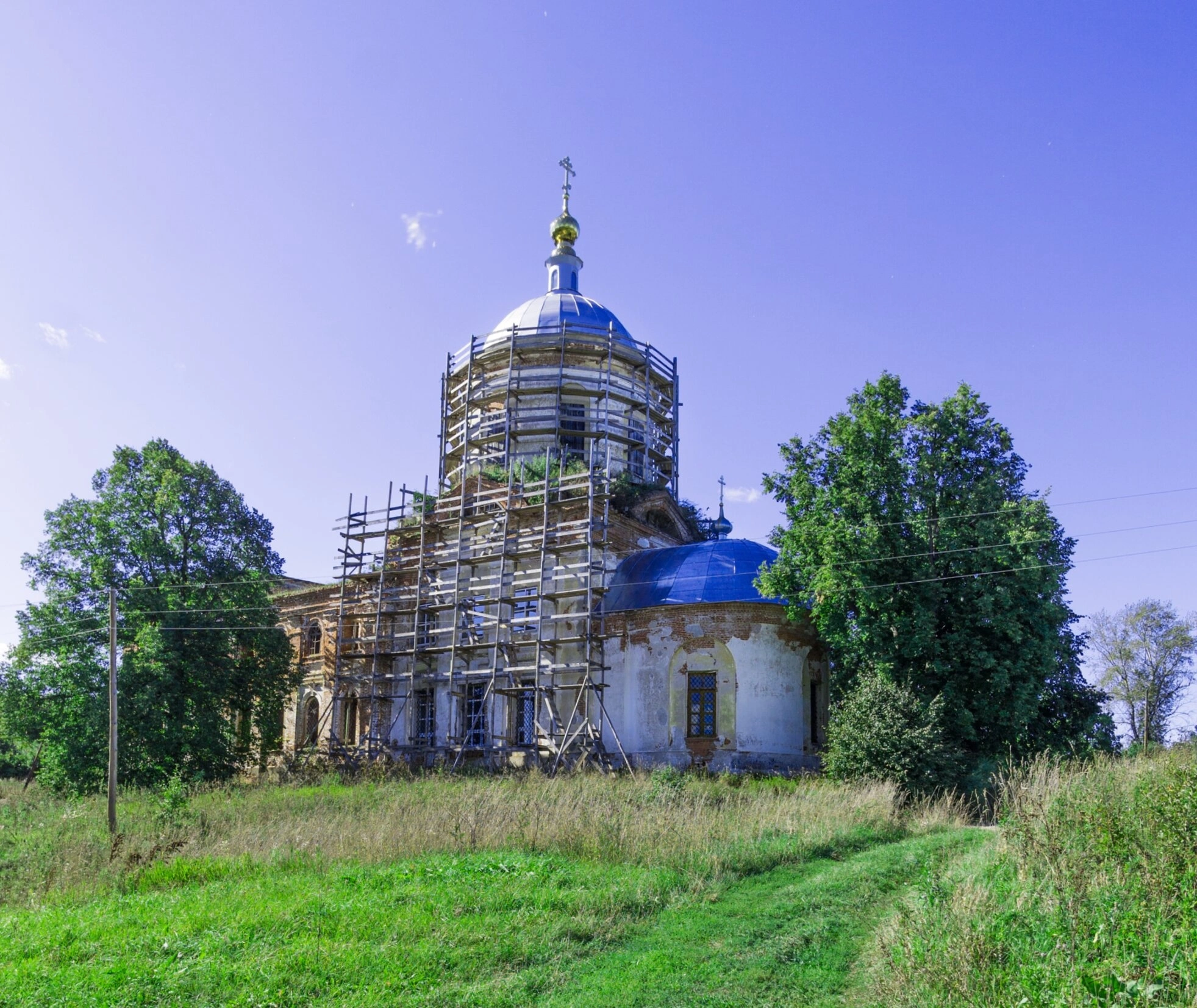На фотографии запечатлена Церковь Преподобного Сергия Радонежского, расположенная в селе Тепелево Дальнеконстантиновского района. Храм находится в процессе реставрации, о чем свидетельствуют установленные строительные леса вокруг центрального купола и части фасада. Эти необходимые работы направлены на сохранение уникального архитектурного памятника для будущих поколений.