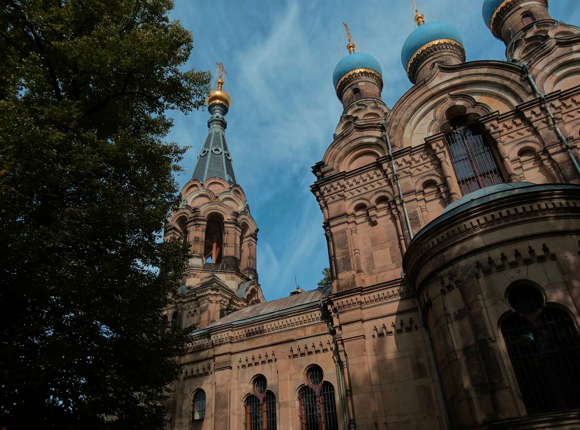 На фотографии запечатлён величественный вид русского православного храма во имя Преподобного Симеона Столпника, Дивногорского чудотворца, расположенного в саксонском городе Дрездене. Белоснежные стены церкви, увенчанные златоглавыми куполами с крестами, ярко выделяются на фоне неба, воплощая собой образ духовной твердыни и благодати Божией.