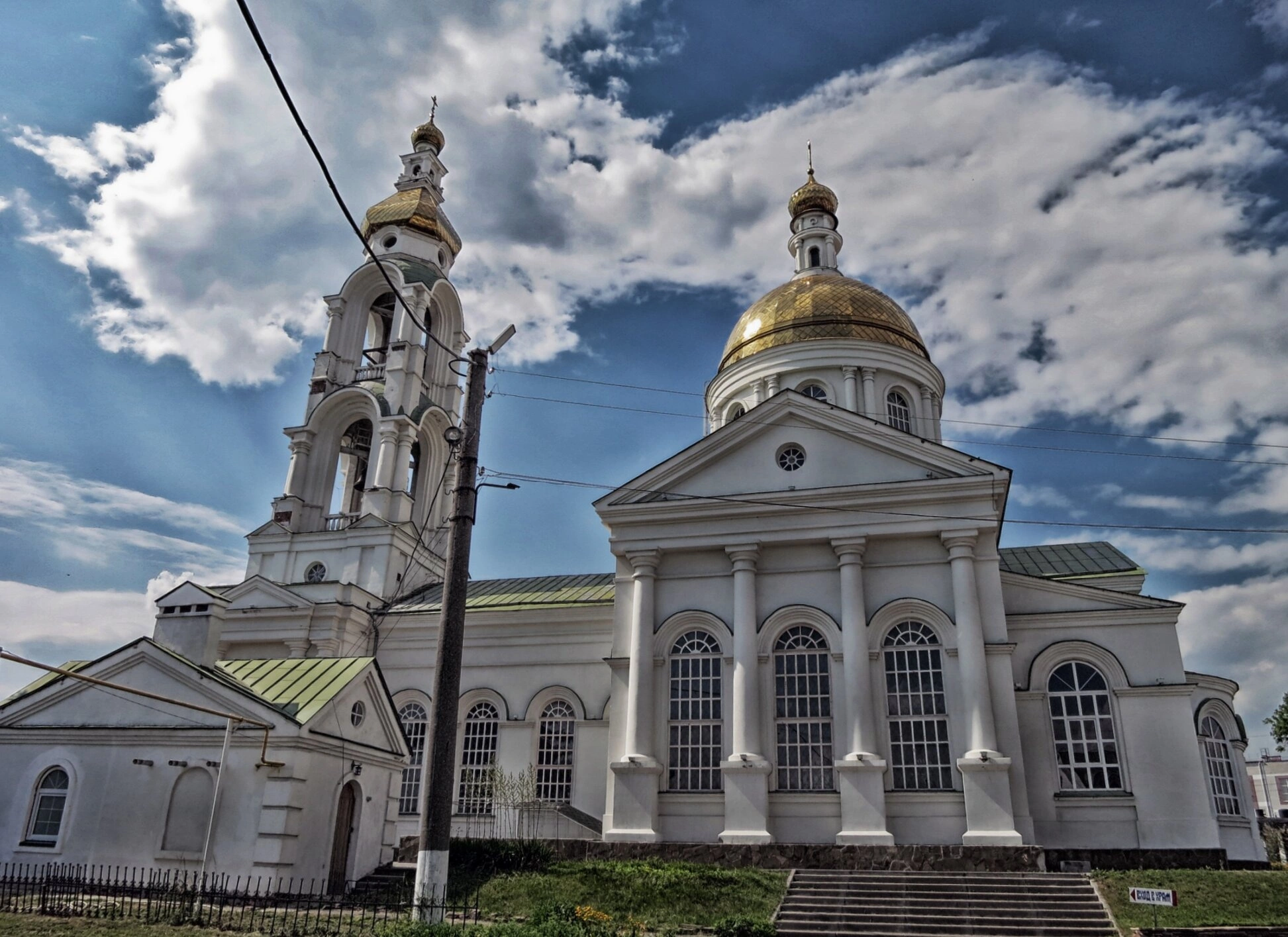 На переднем плане фотографии видна небольшая пристройка с зелёной кровлей и металлическая ограда. Также в кадр попали деревянный столб с проводами и каменные ступени, ведущие к главному входу в храм.