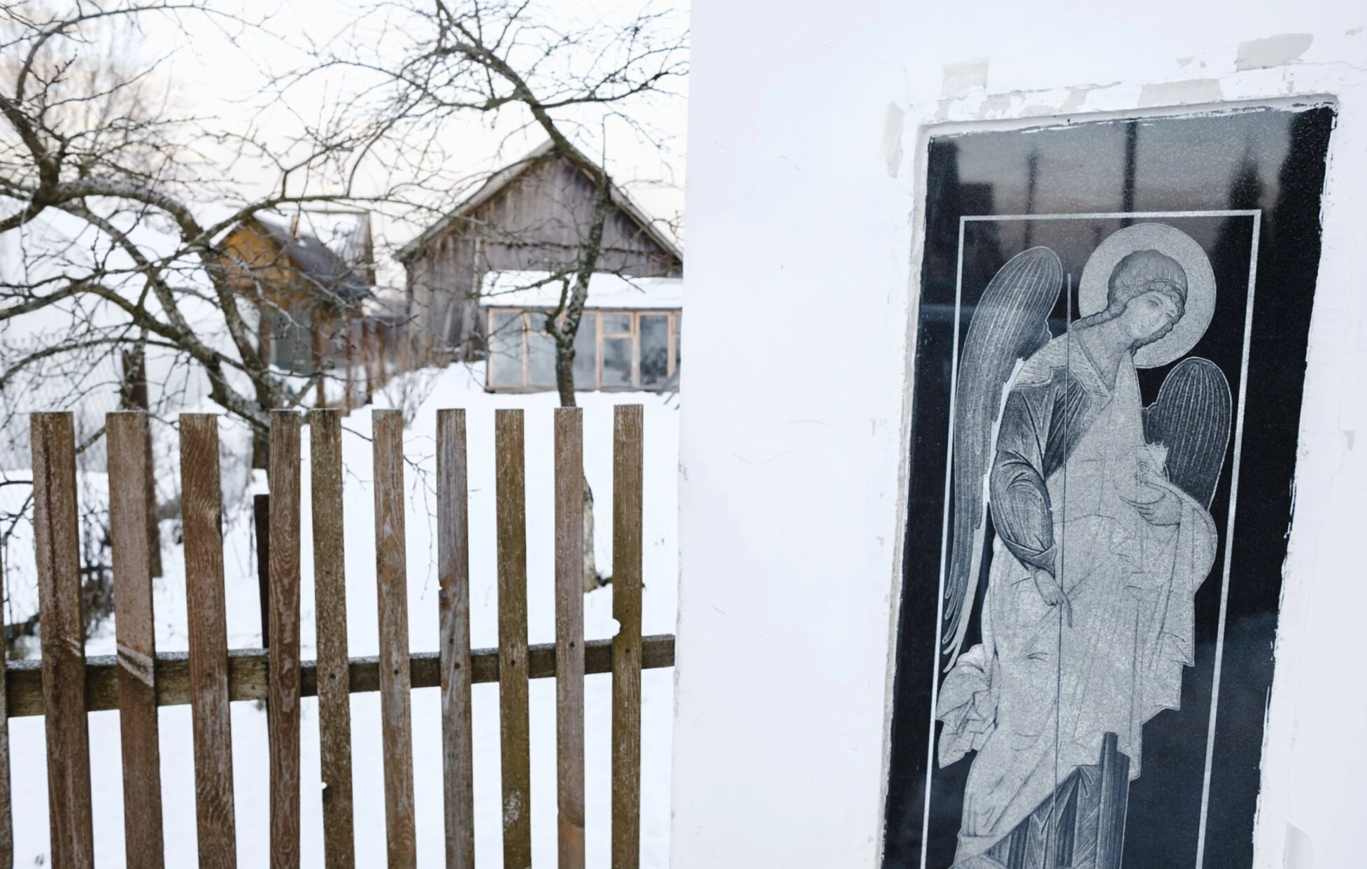 На переднем плане изображения виден деревянный забор, характерный для сельской архитектуры данного региона. За ним простирается заснеженный двор, где возвышается храмовое здание. Особого внимания заслуживает фрагмент белой стены с темным прямоугольным изображением, напоминающим икону или витраж с образом ангела. Этот элемент указывает на сакральное назначение сооружения.