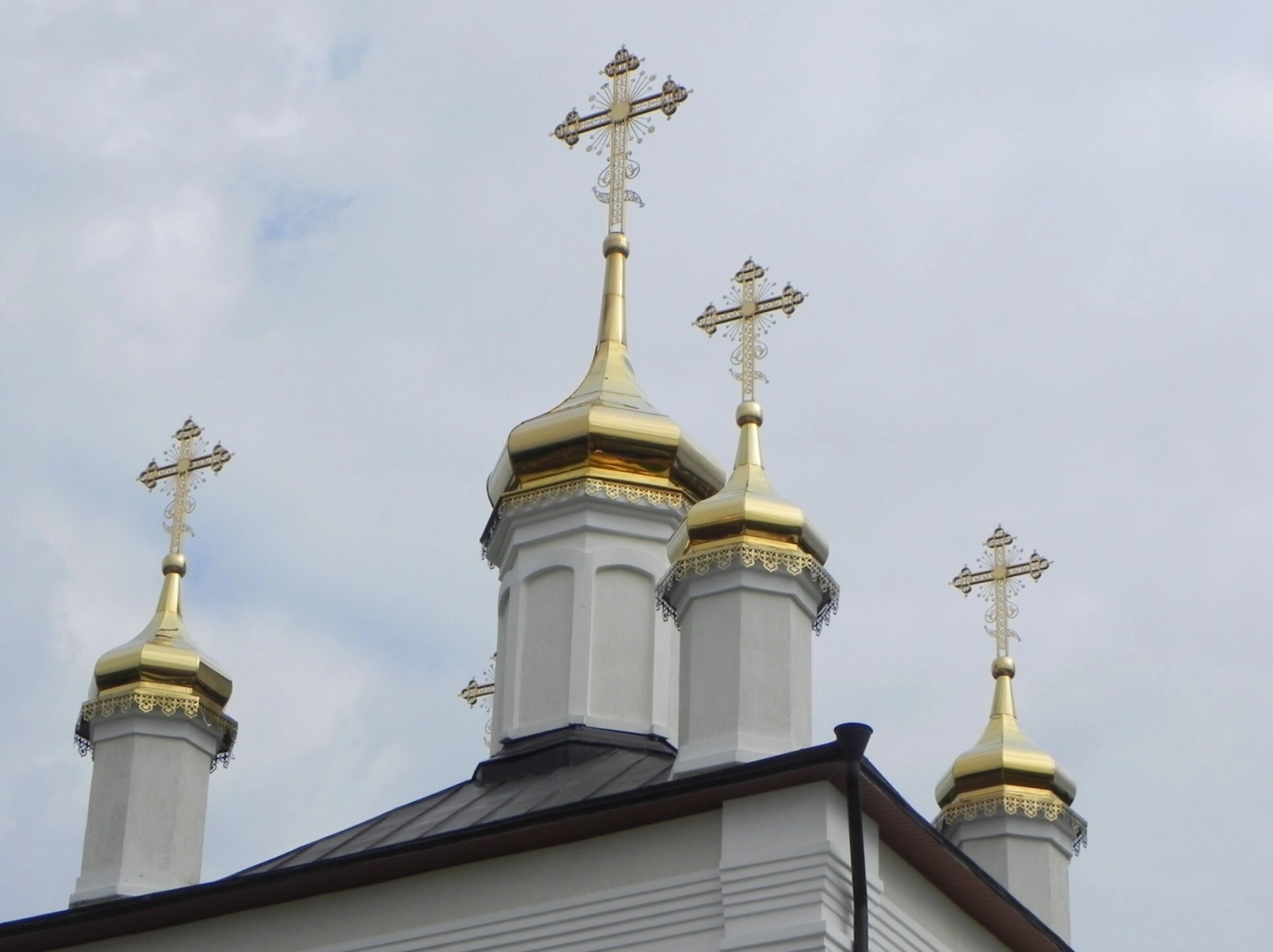 На фотографии запечатлены величественные золочёные купола и чеканные кресты православного храма, сияющие в лучах солнца. Малые луковичные главки, увенчанные восьмиконечными крестами, группируются вокруг центрального барабана, что является характерным элементом русской церковной архитектуры. Золото куполов символизирует небесную славу и вечные ценности, а кресты, устремлённые ввысь, обозначают победу жизни над смертью и напоминают верующим о искупительной жертве Спасителя.