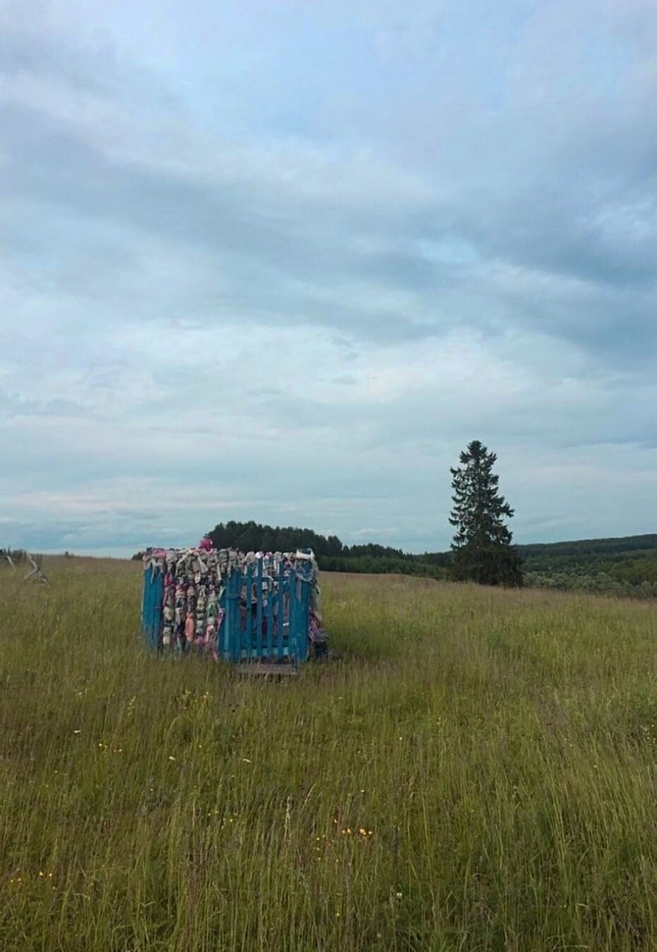 На переднем плане открытой местности, предположительно на кладбище, внимание привлекает дерево, украшенное разноцветными лентами. Подобный обычай часто встречается в марийских священных рощах и вблизи почитаемых мест, что может свидетельствовать о переплетении культурных и религиозных традиций в этом регионе. На некотором удалении виднеются очертания леса, создающие типичный для этих мест пейзаж.