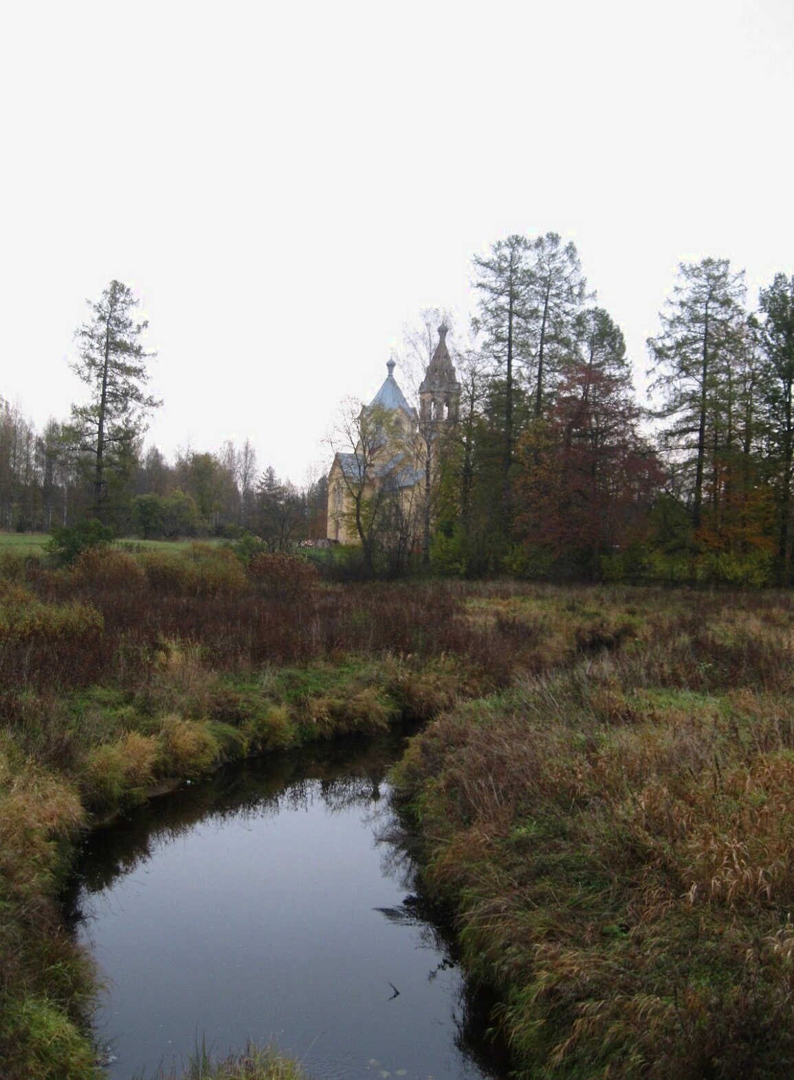 С правой стороны кадра извилистой лентой протекает тихая речка, чьи темные воды невозмутимо отражают светлое небесное покрывало. Берега водоема обильно поросли высокой травой и кустарником, одетыми в осенние убранства. За рекой простирается лесной массив, обрамляющий храм и создающий ощущение уединенности и покоя, столь свойственное этому святому месту.