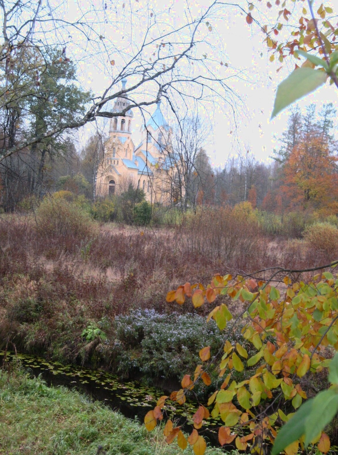На переднем плане фотографии виден извилистый канал, обрамленный пожухлой осенней растительностью. Слева возвышается дерево с обнаженными ветвями, а справа — ветви деревьев с желто-зеленой листвой, создающие естественное обрамление для храмового комплекса. Вода в канале спокойно отражает осеннее небо, усиливая общее настроение умиротворенности.