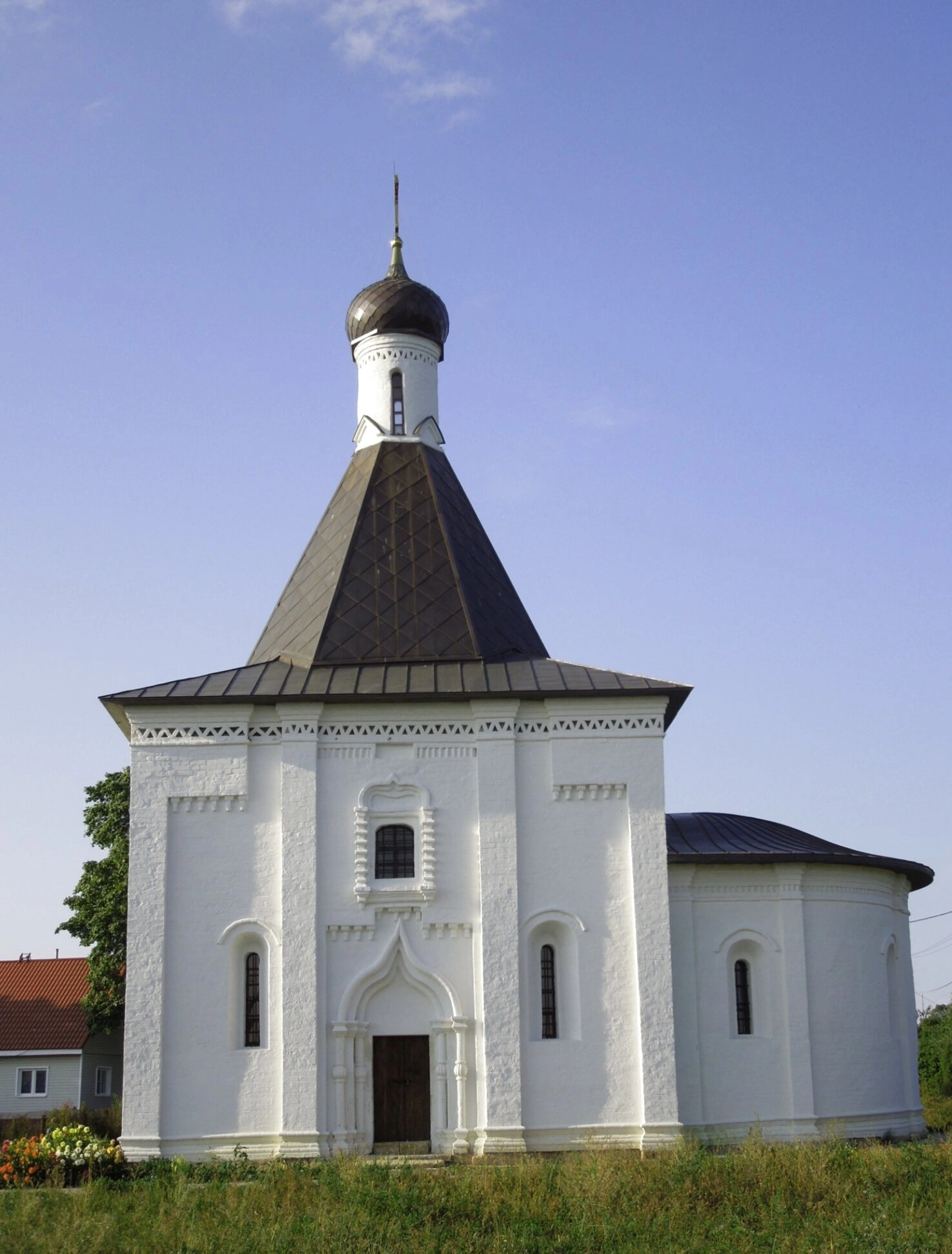 На представленной фотографии запечатлён старинный православный храм — Церковь во имя святого Пророка Божия Илии, что располагается в селе Пруссы Ступинского района Московской области. Этот уникальный памятник церковного зодчества был возведён в 70-х годах XVII века из белого камня и является ярким примером шатровой архитектуры того периода.