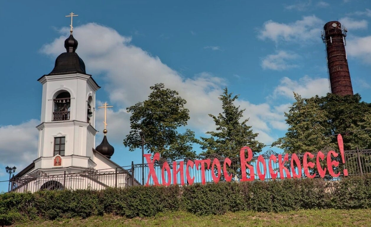 Перед святым храмом виднеется ухоженная зелёная растительность, а на первом плане располагается красная праздничная надпись «Христос Воскресе!», свидетельствующая о съёмке в светлые пасхальные дни. Эта надпись добавляет изображению особую торжественность и ликующую радость, напоминая о главном событии христианской истории.
