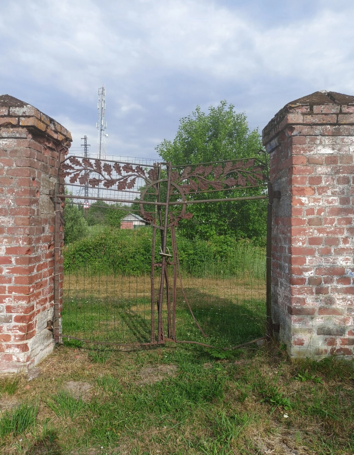 На представленной фотографии запечатлены исторические въездные ворота и вид на храм в честь святого Пророка Божия Илии, расположенный в деревне Черное Всеволожского района Ленинградской области. Монументальные кирпичные столбы, увенчанные декоративными элементами, и массивные кованые ворота с ажурным узором из листьев и веток являются сохранившейся частью ограды церковной территории.