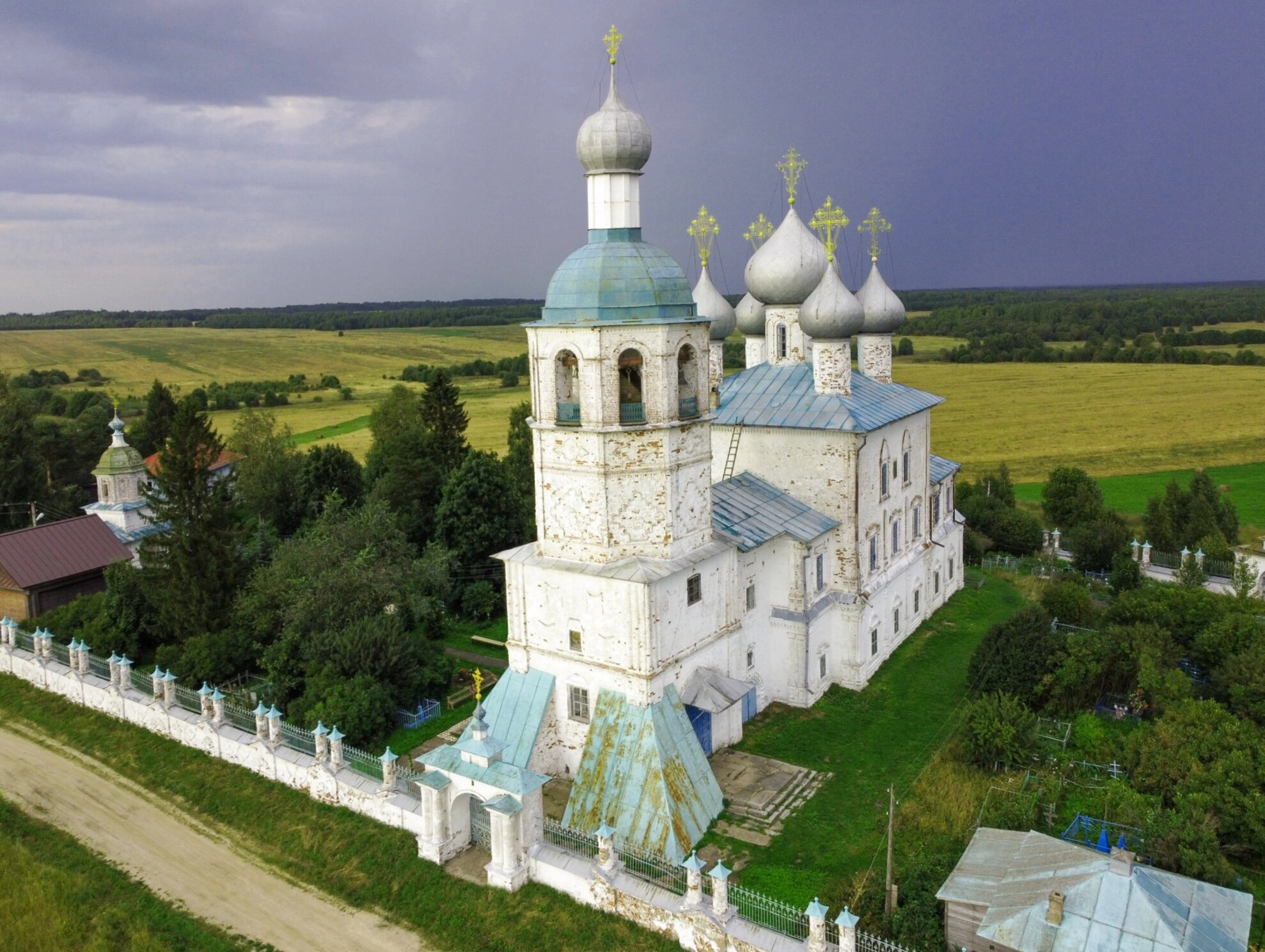 Церковь Пророка Илии в Засодимье гармонично вписана в окружающий ландшафт. На фотографии видно, как белоснежные стены храма contrastно выделяются на фоне бескрайних полей и густых лесных массивов, создавая ощущение уединённости и благодатного покоя. Небесная сфера, затянутая облаками, подчёркивает величие и духовную силу этого намоленного места.