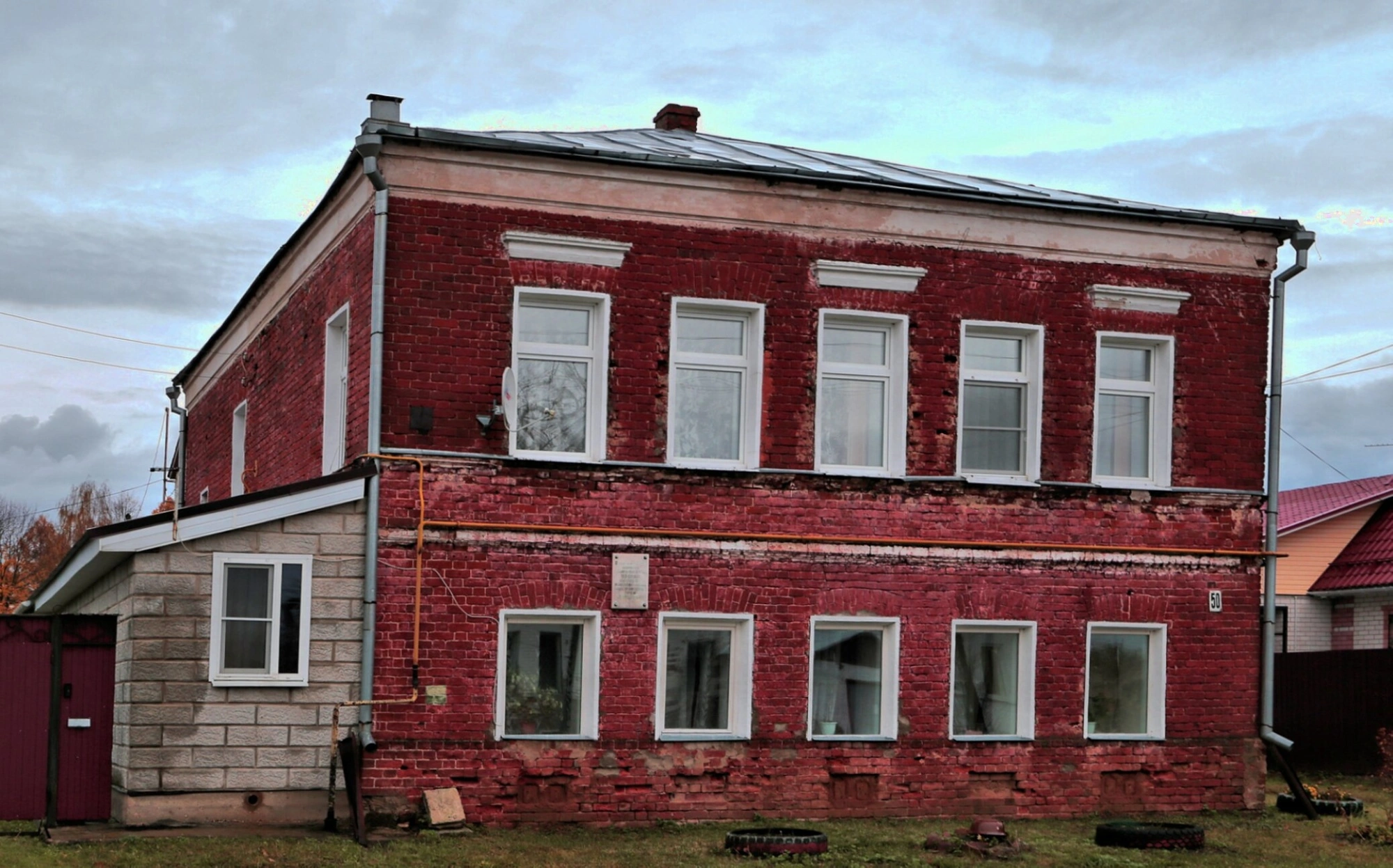 С левой стороны к основному зданию примыкает одноэтажная пристройка, выполненная из кирпича более светлого оттенка. На кровле здания хорошо различимы элементы традиционной храмовой архитектуры, включая металлическую систему водостока и дымоход. Вдоль фасада проходит газовая труба желтого цвета, свидетельствующая о современных коммуникациях.