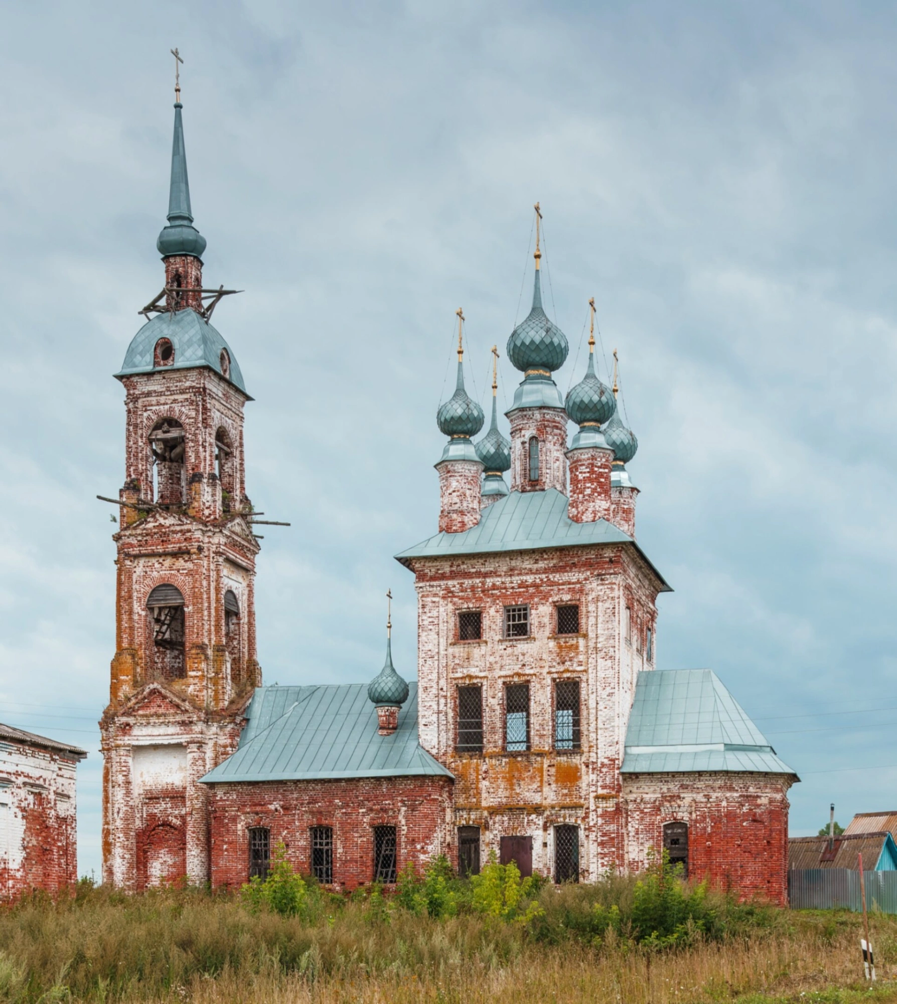 На представленной фотографии запечатлена Церковь Пятницкая, также известная как Вознесенская, расположенная в селе Введеньё Шуйского района Ивановской области. Этот православный храм, ныне пребывающий в полуразрушенном состоянии, представляет собой значительный памятник церковной архитектуры.
