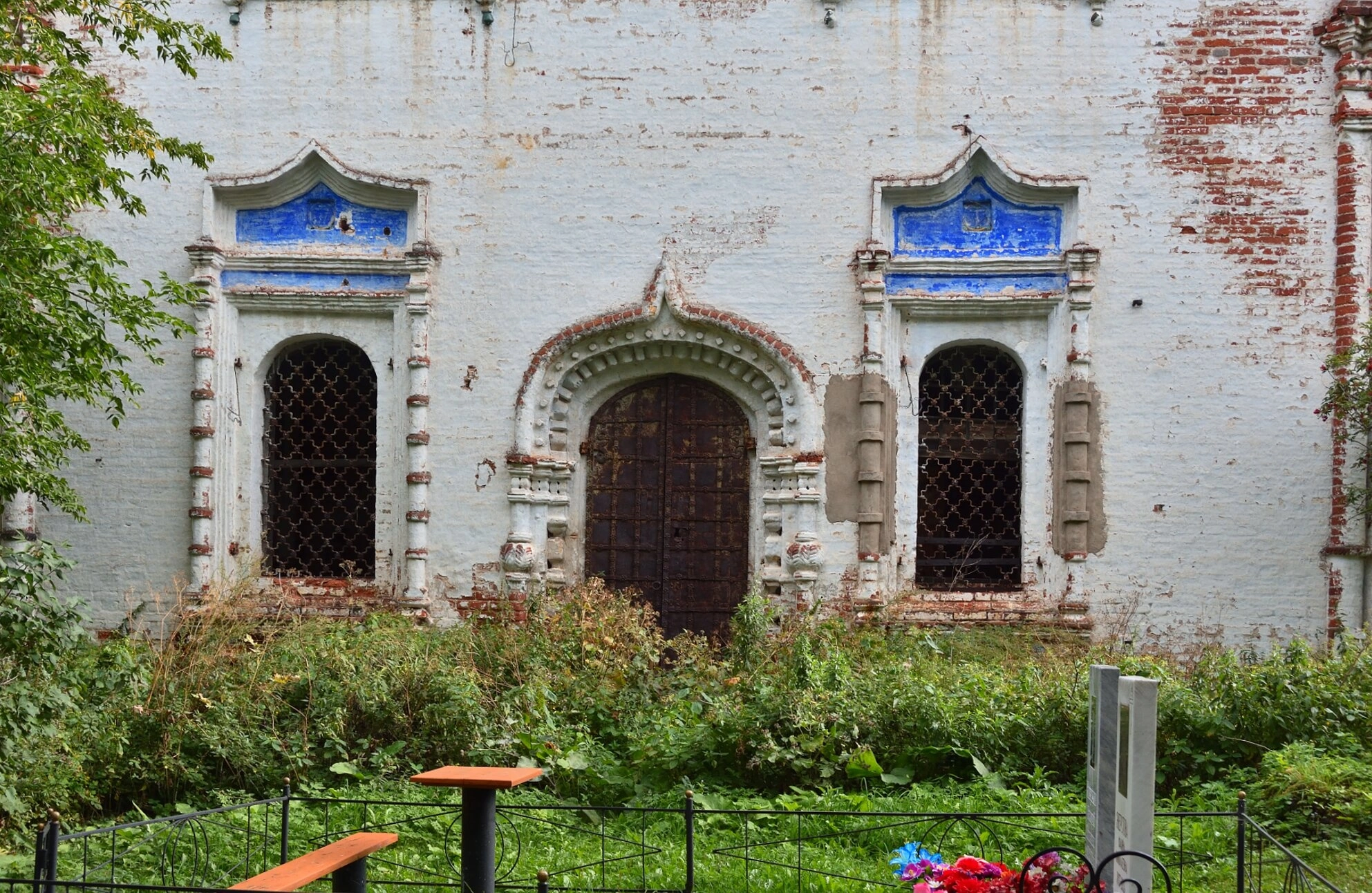 Центральным элементом композиции является массивная деревянная дверь, украшенная коваными металлическими петлями. Подобные двери были характерны для храмовых построек, символизируя вход в священное пространство. Арочный проём над дверью дополнен декоративными элементами, что подчёркивает значимость входа в дом Божий. По обе стороны от двери расположены арочные окна с решётками, которые обеспечивают естественное освещение внутреннего пространства храма. Сверху окна украшены декоративными деталями синего цвета, что добавляет фасаду цветовой акцент и выделяет его на фоне белых стен.