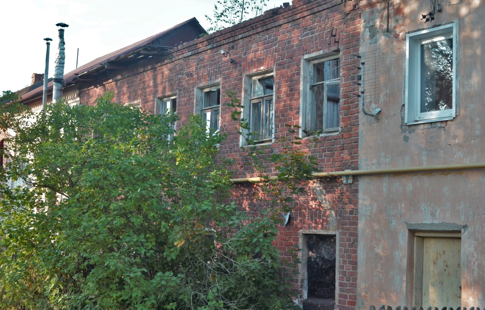 На фотографии видны оконные проёмы, часть которых находится в различном состоянии: некоторые заколочены, другие сохранили остекление. Кустарниковая растительность на переднем плане создаёт естественное обрамление для храмового здания, подчёркивая его историческую ценность как объекта культурного наследия Некрасовского района.