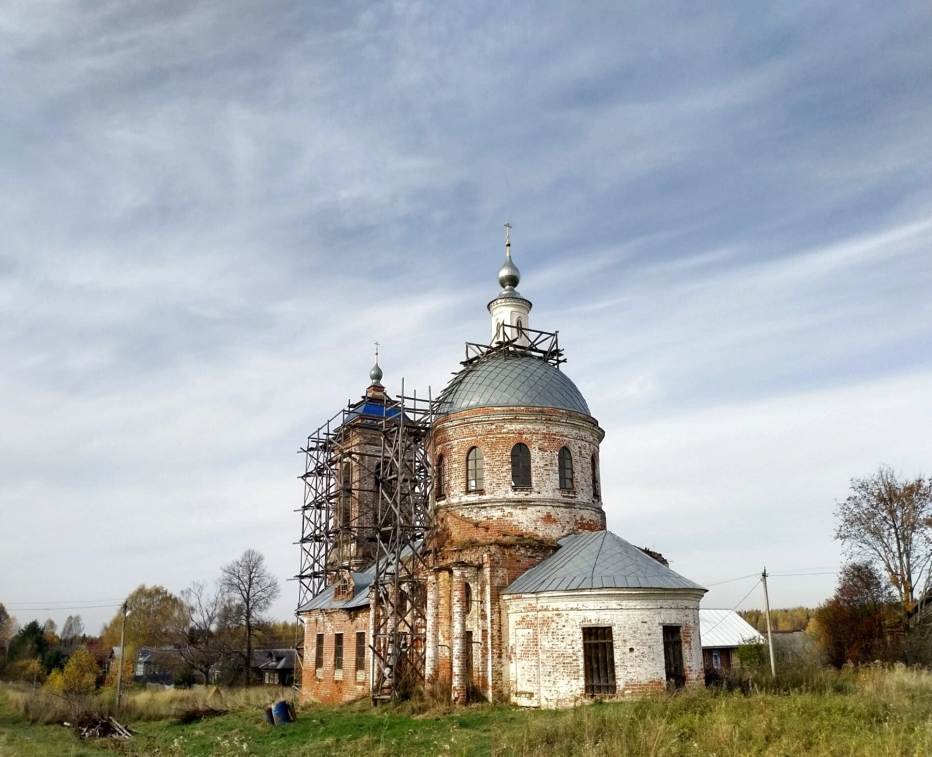 На момент съёмки храм находится в состоянии реставрационных работ, о чём свидетельствуют строительные леса, установленные на одной из колоколен. Это указывает на ongoing процесс восстановления исторического облика святыни. Окружающая территория характеризуется осенним пейзажем с деревьями, одетыми в жёлтую листву, и скромными сельскими постройками, создающими атмосферу провинциальной России.