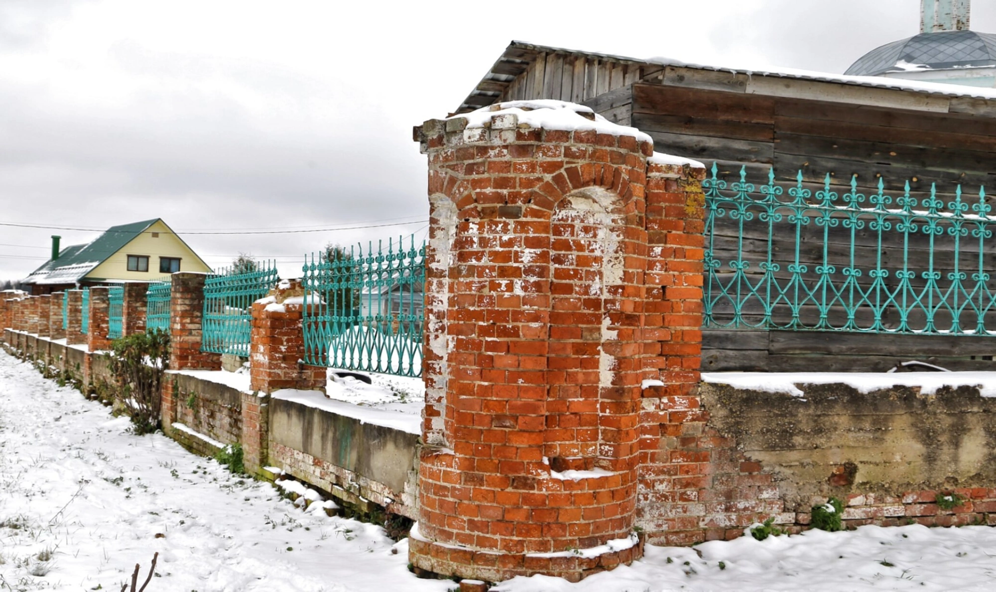 На переднем плане изображения находится историческая кирпичная ограда с ажурными металлическими решётками бирюзового цвета, ныне пребывающая в состоянии благородной ветхости. Снежный покров, укутавший архитектурные формы, подчёркивает древность священного места и создаёт атмосферу духовной сосредоточенности.