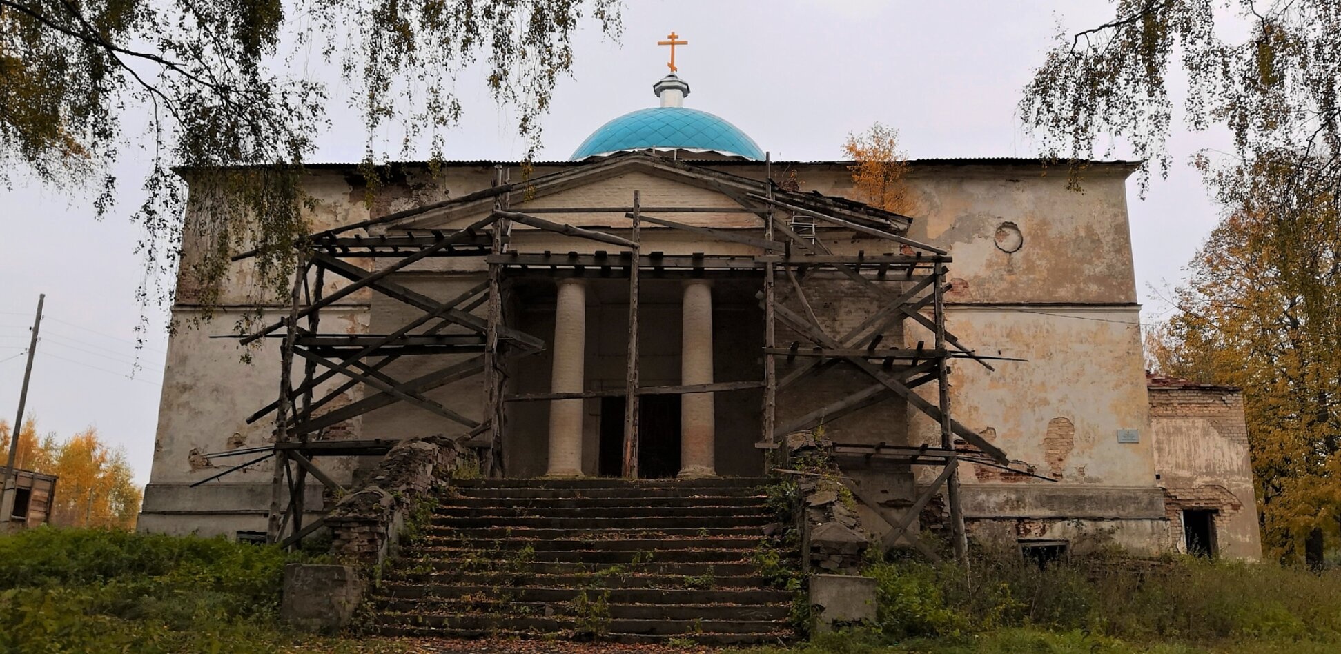 Обнадёживающим знаком являются строительные леса, установленные перед портиком и лестницей храма. Эти временные конструкции свидетельствуют о начавшихся работах по реставрации или консервации святыни, что вселяет надежду на её будущее возрождение.