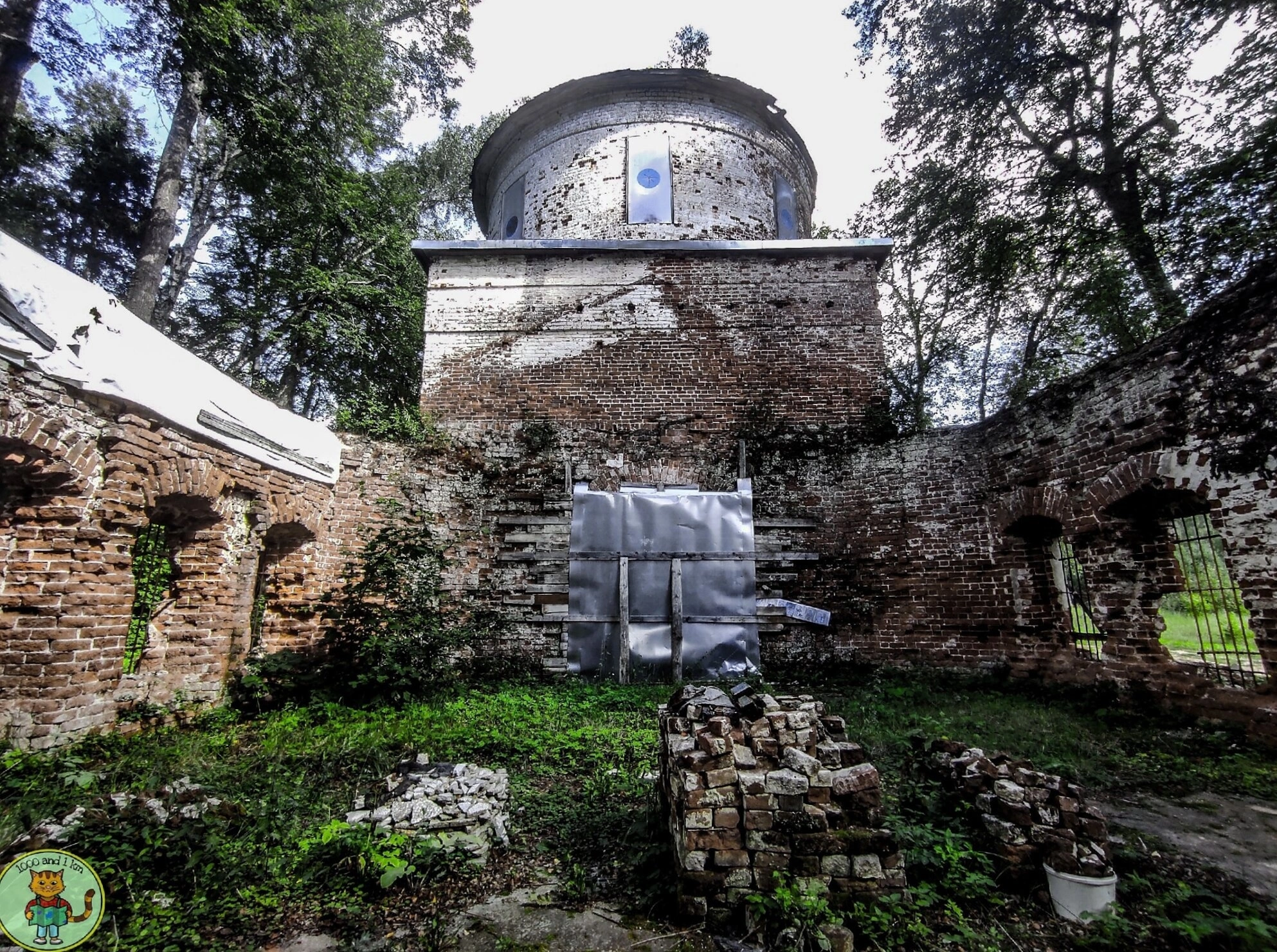 Территория вокруг церкви полностью заросла дикорастущей растительностью, включая кустарники и деревья, которые постепенно разрушают конструкцию здания. Повсеместно видны обломки кирпичей и фрагменты декоративных элементов, некогда украшавших святыню. Несмотря на плачевное состояние, храм сохраняет величие и духовную значимость для православных верующих.