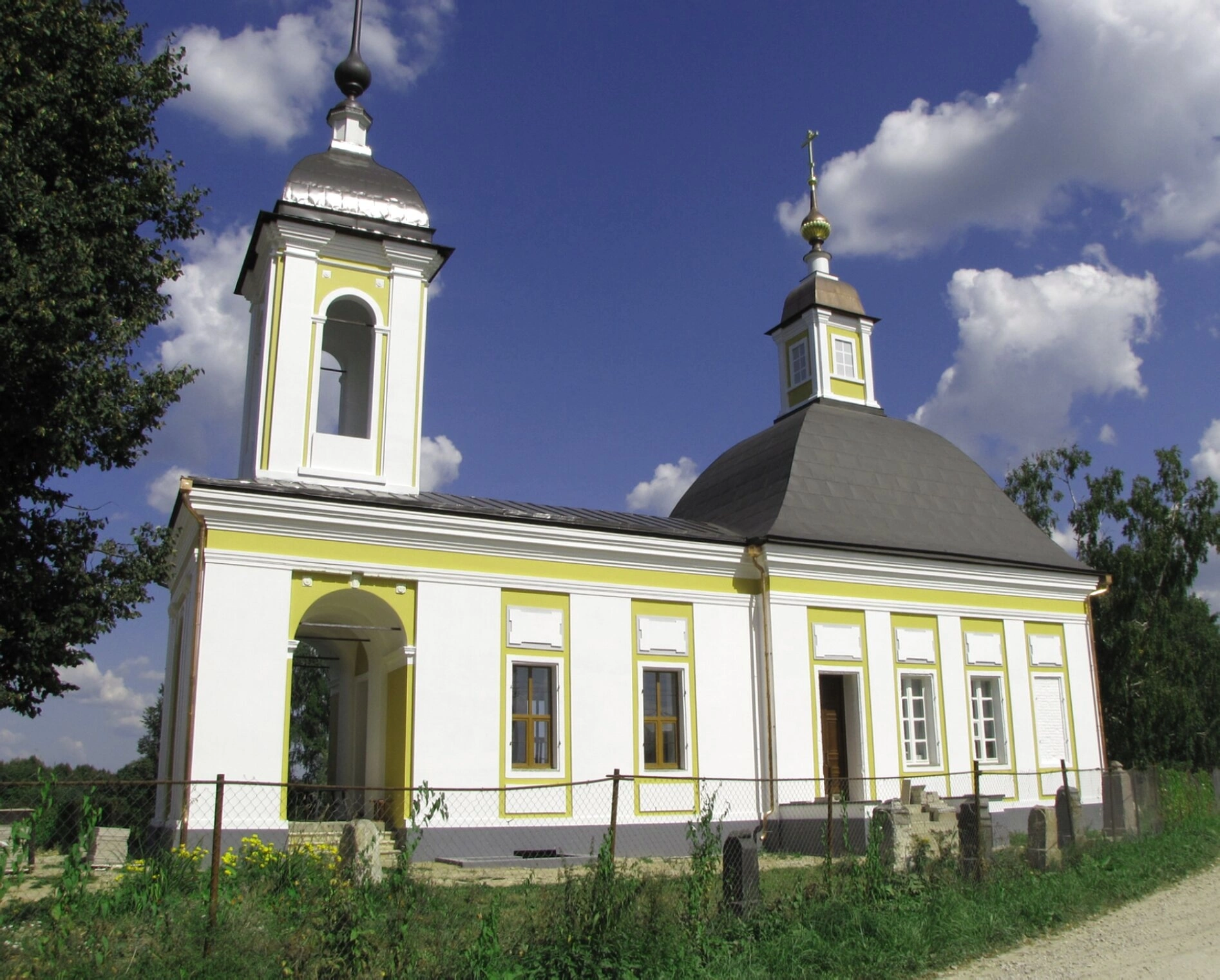Храмовая территория обнесена невысокой оградой. На переднем плане фотографии просматривается грунтовая дорога, проходящая справа от церковной ограды. Естественное окружение составляют зеленые насаждения и травяной покров, создающие гармоничный природный фон для архитектурного памятника. Небесный свод представлен ясной лазурью с легкими облачными образованиями.