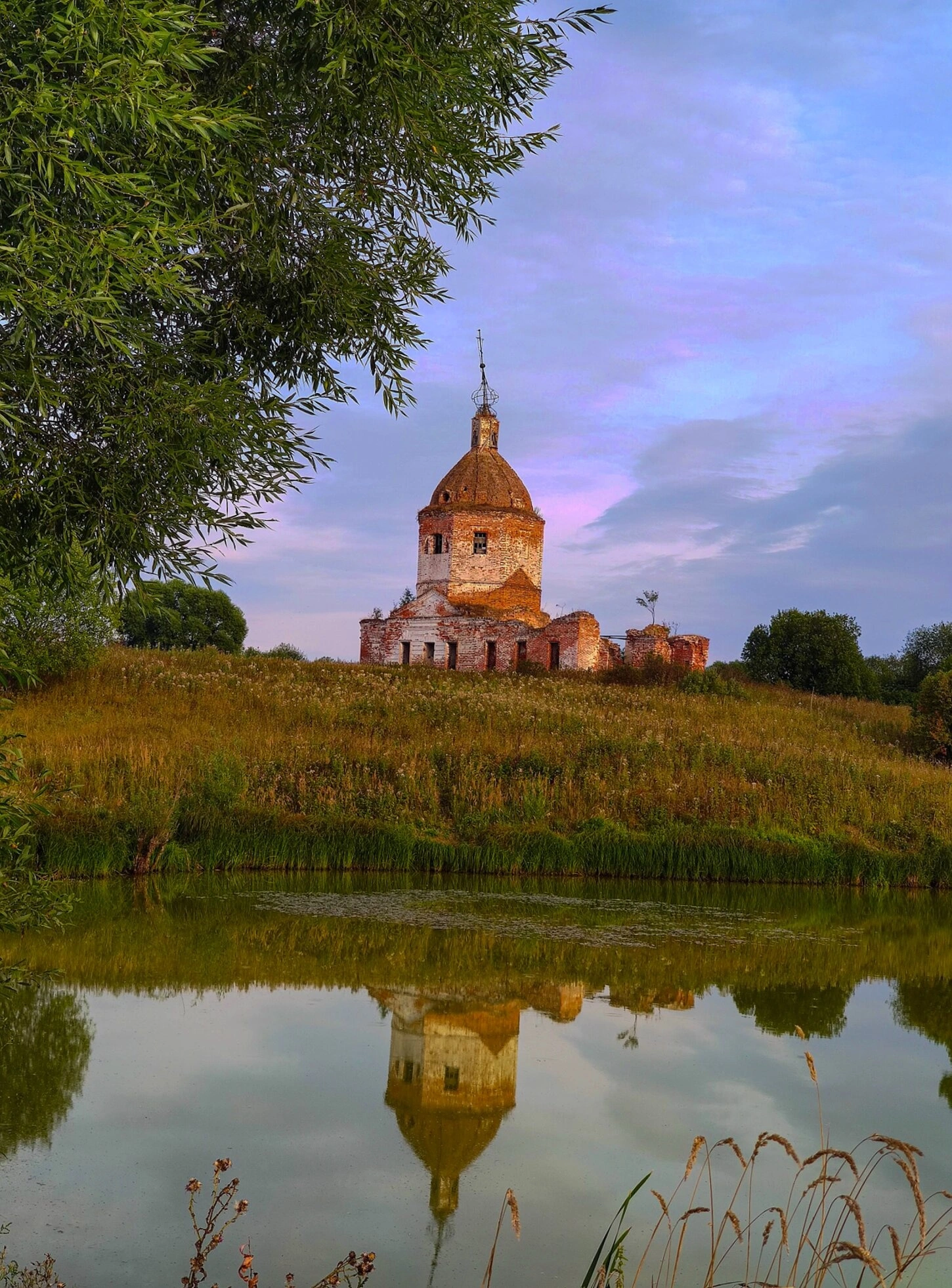 Особую художественную ценность снимку придает зеркальное отражение церковного здания в спокойных водах водоёма, расположенного на переднем плане. Сохранившийся купол с православным крестом свидетельствует о былом благолепии этого священного места, хотя кирпичные стены требуют восстановительных работ.