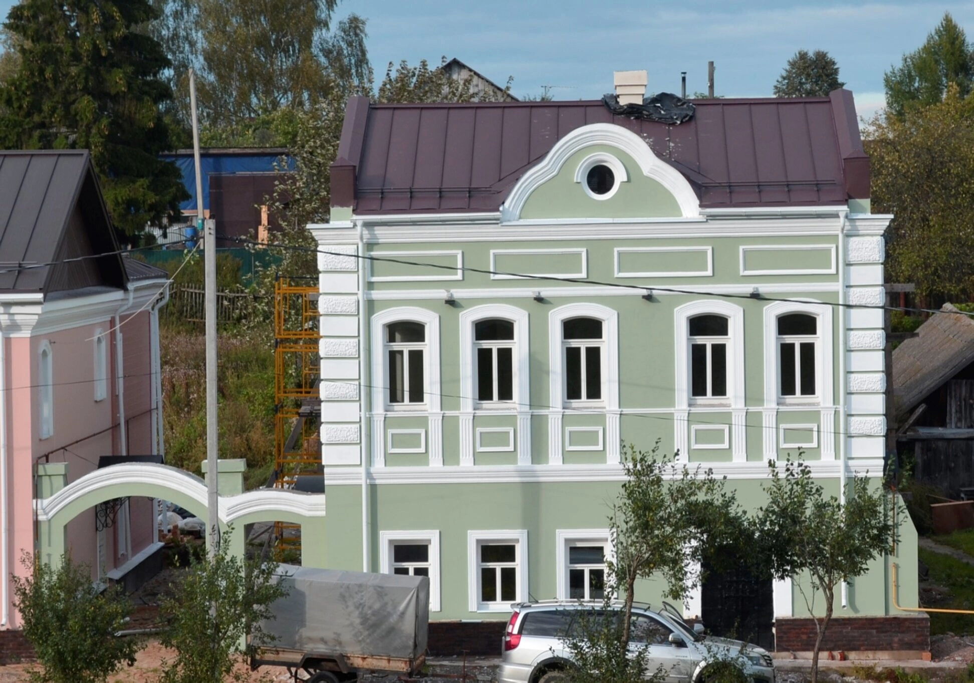 На представленной фотографии запечатлена Церковь Рождества Пресвятой Богородицы, расположенная в историческом селе Вятском Некрасовского района Ярославской области. Храм представляет собой двухэтажное здание, выполненное в светло-зеленых тонах с изящными белыми архитектурными деталями, что характерно для традиционного русского церковного зодчества.