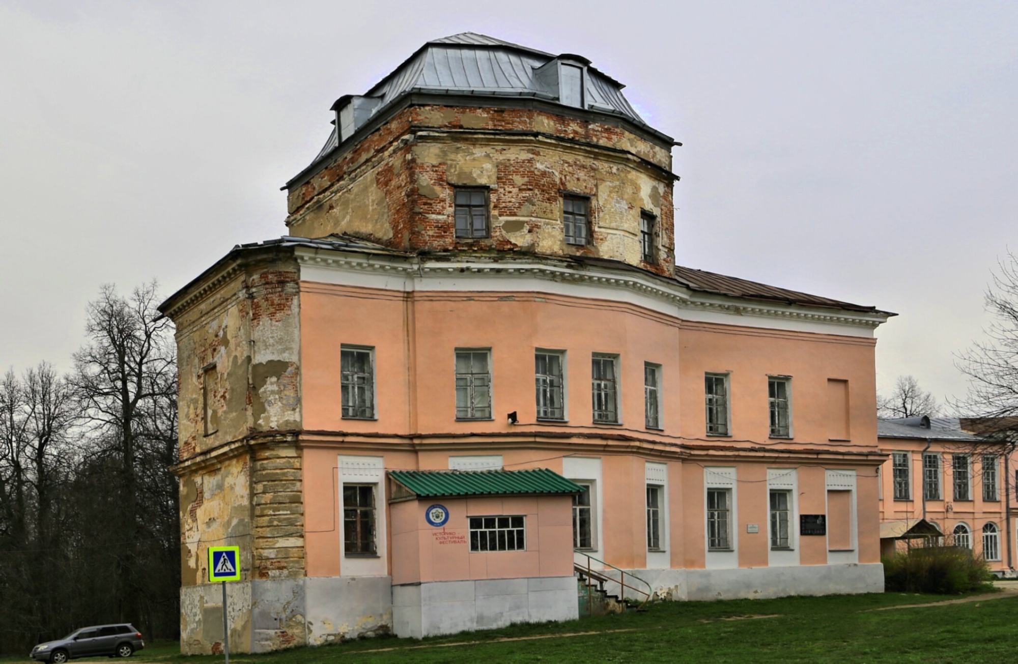 Прилегающая территория также свидетельствует о забвении: рядом с храмом установлен дорожный знак пешеходного перехода, что указывает на близость транспортной магистрали. На заднем плане фотографии виднеется автомобиль и оголенные деревья, создающие атмосферу осеннего или ранневесеннего периода.
